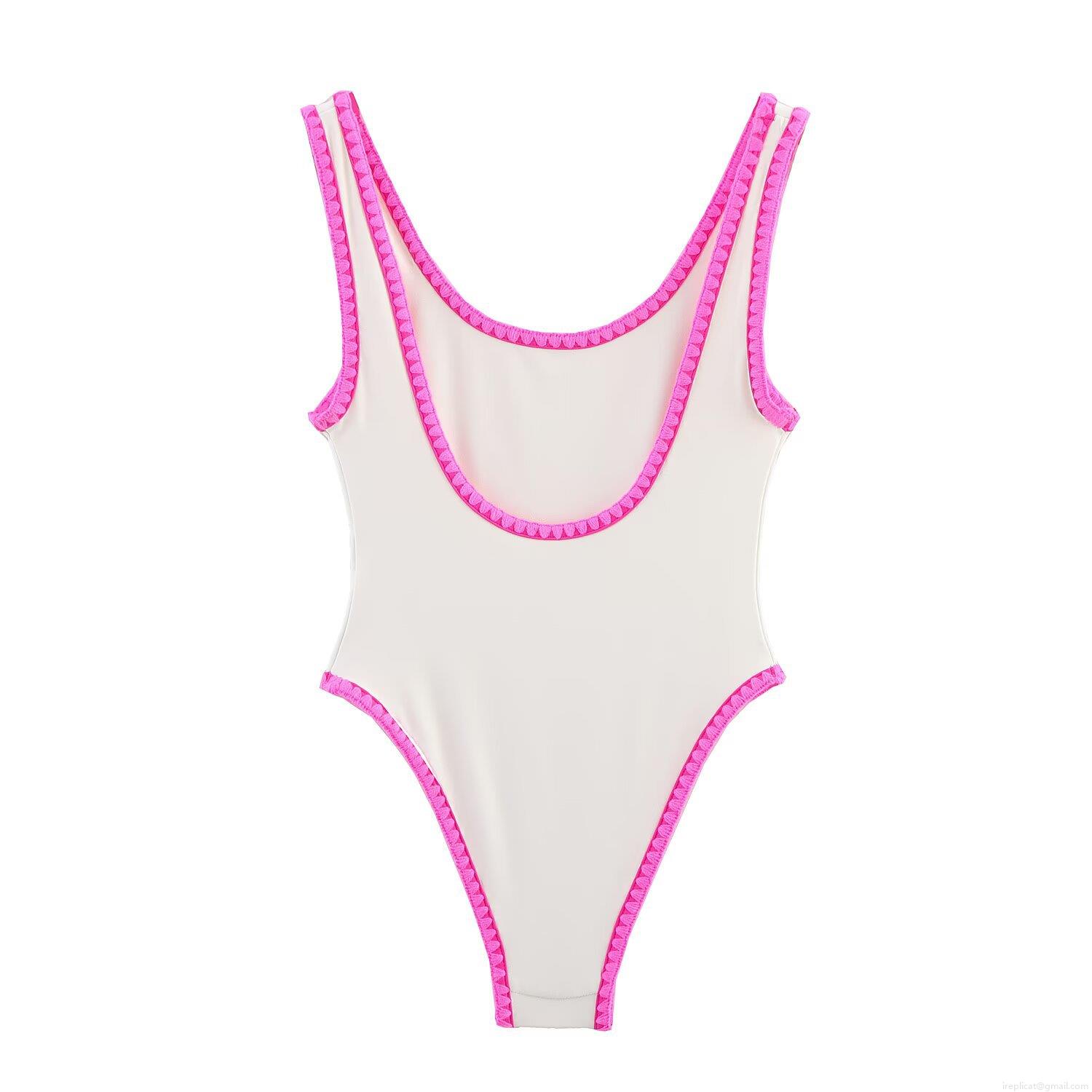 • Women's One Piece Swimsuit White Pink Contrast Scalloped Trim High Stretch Beach Swimwear Summer Vacation Bathing Suit For Women