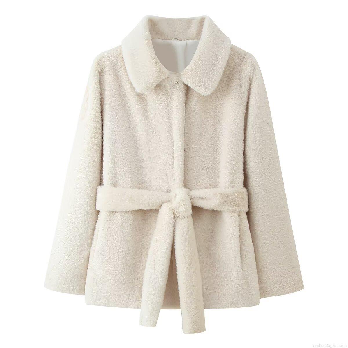 Elegant Faux Fur Coat With Belt Women Autumn Winter Long Sleeve Plush Jacket Lapel Neck Solid Color Warm Outerwear Streetwear