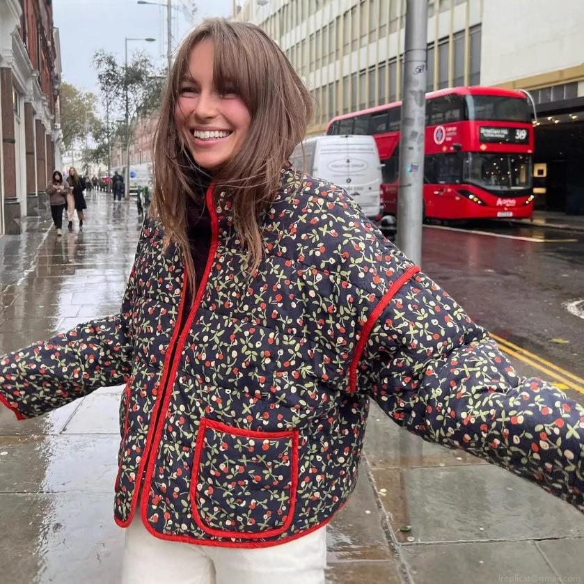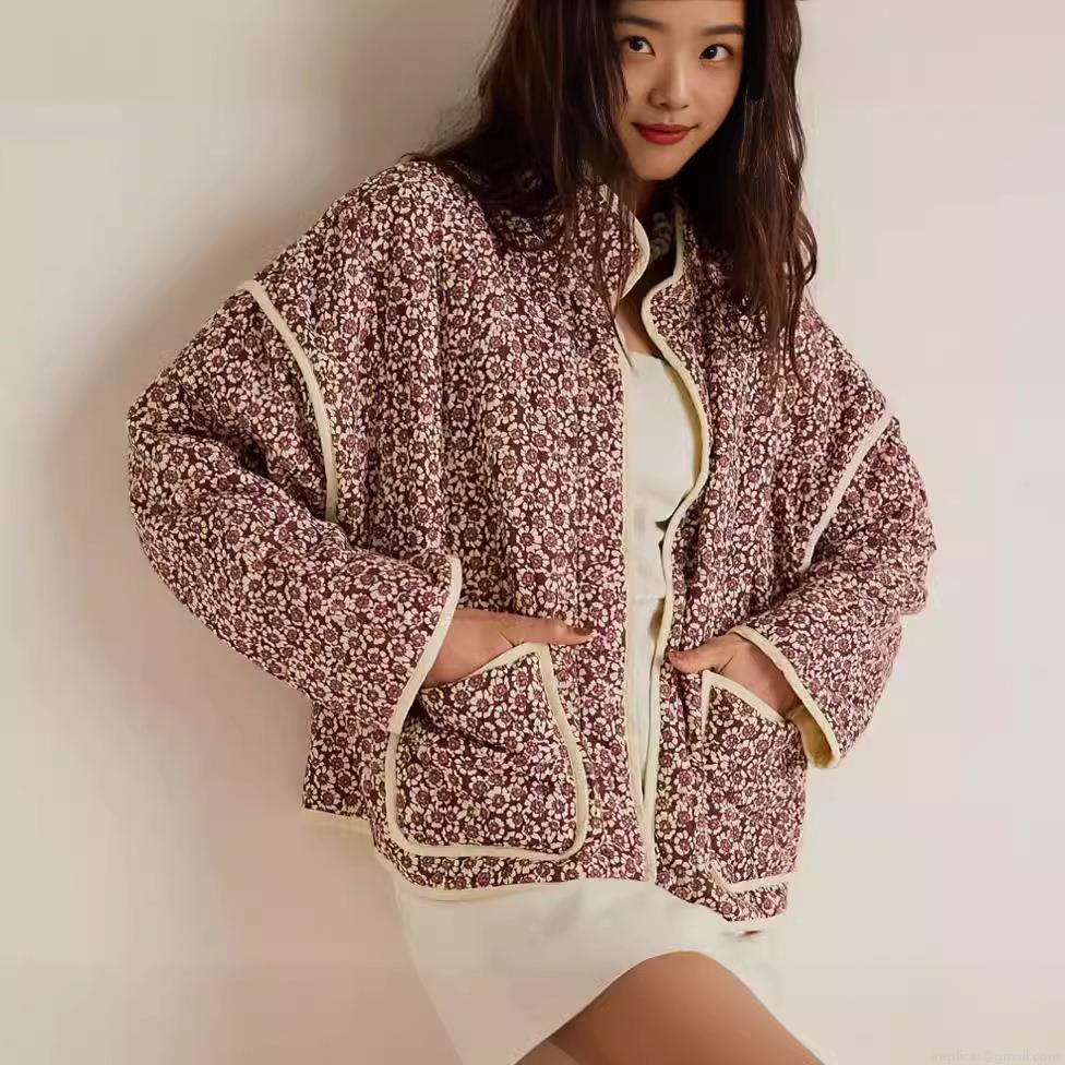 • French Retro Floral Printed Quilted Jacket Women Vintage Lightweight Cotton Padded Coat Casual Loose Long Sleeve Printed Outerwear For Spring Autumn