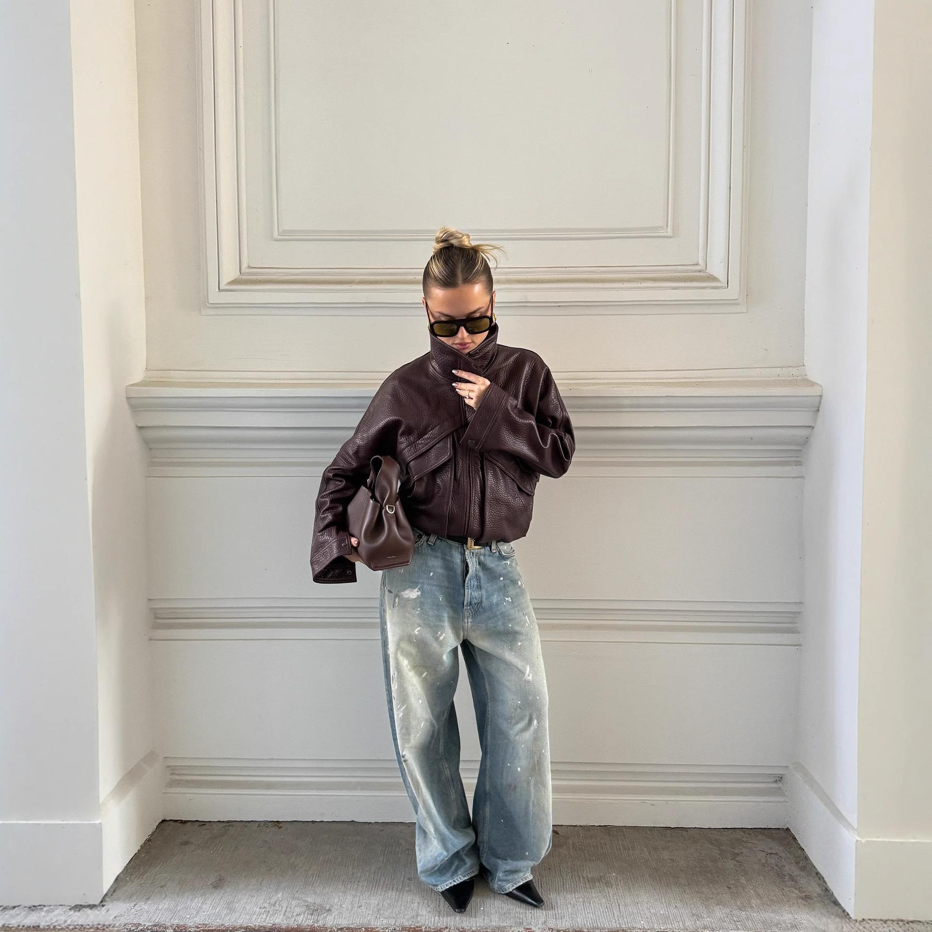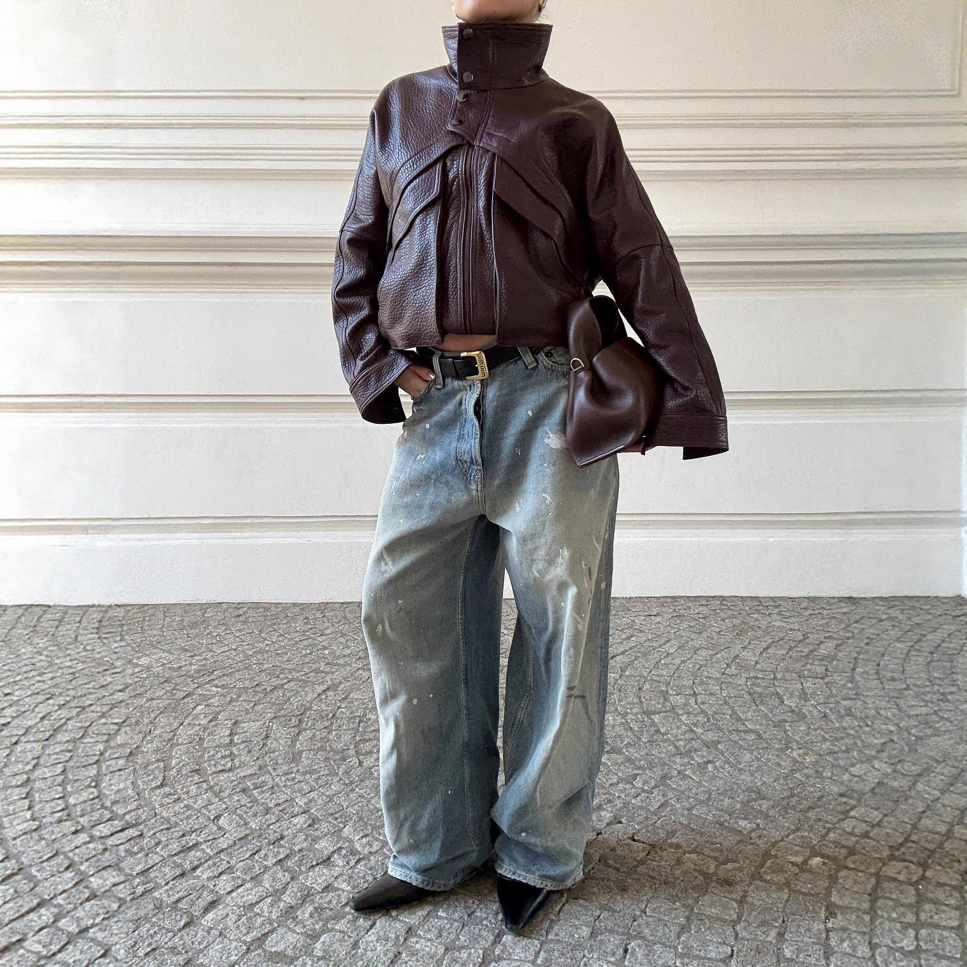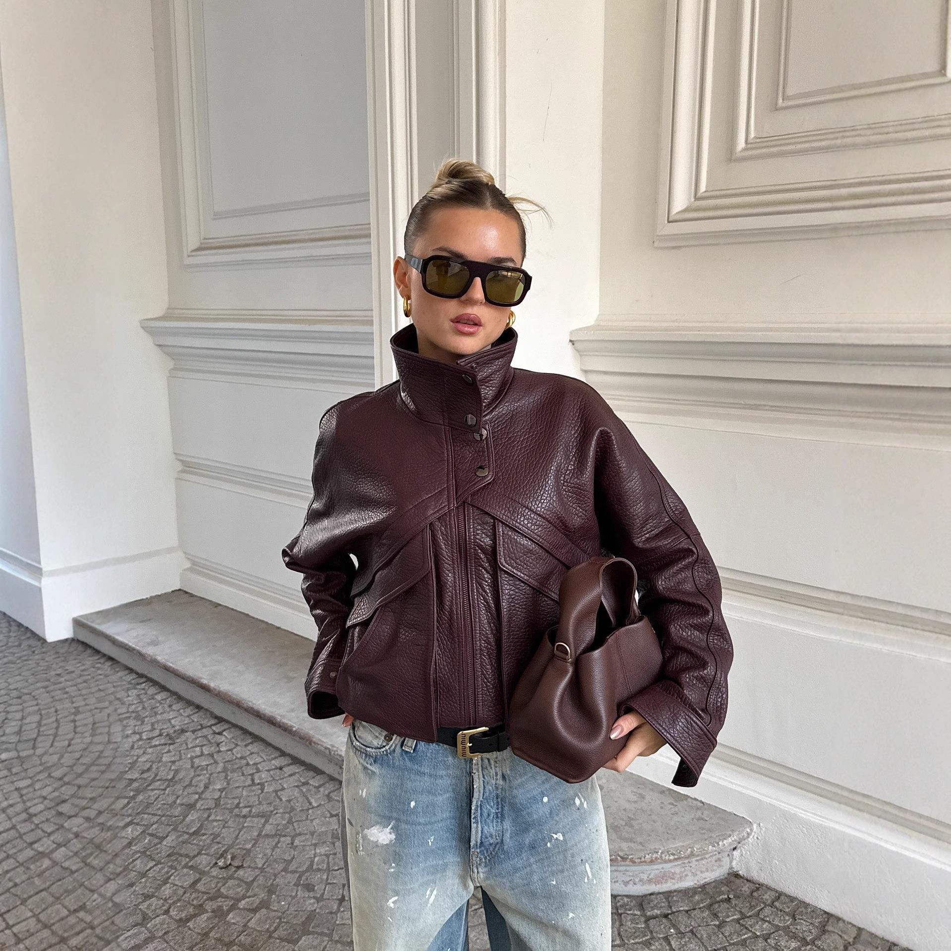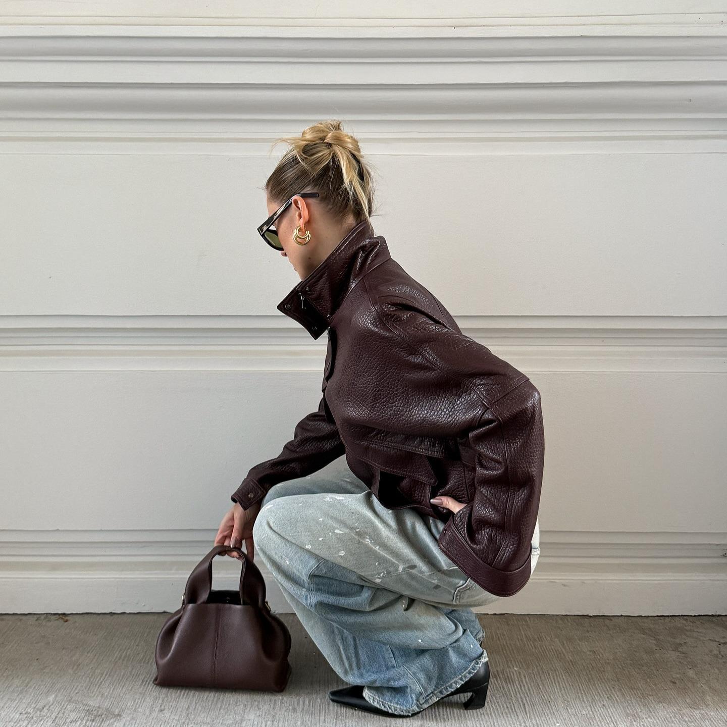 • French Vintage Faux Leather Moto Jacket Women Stand Collar Zipper Short Coat Polyester Reddish Brown Autumn Streetwear Outerwear