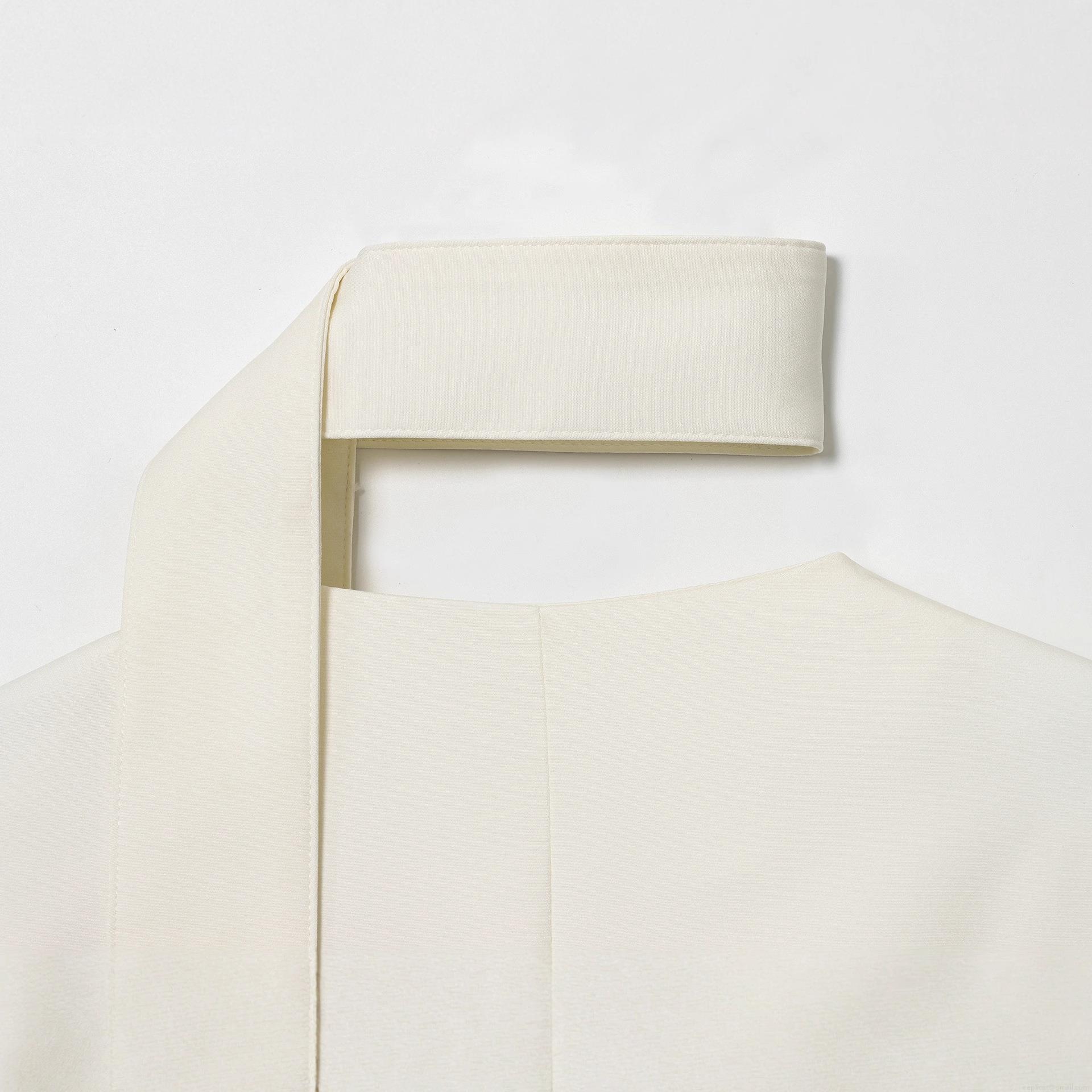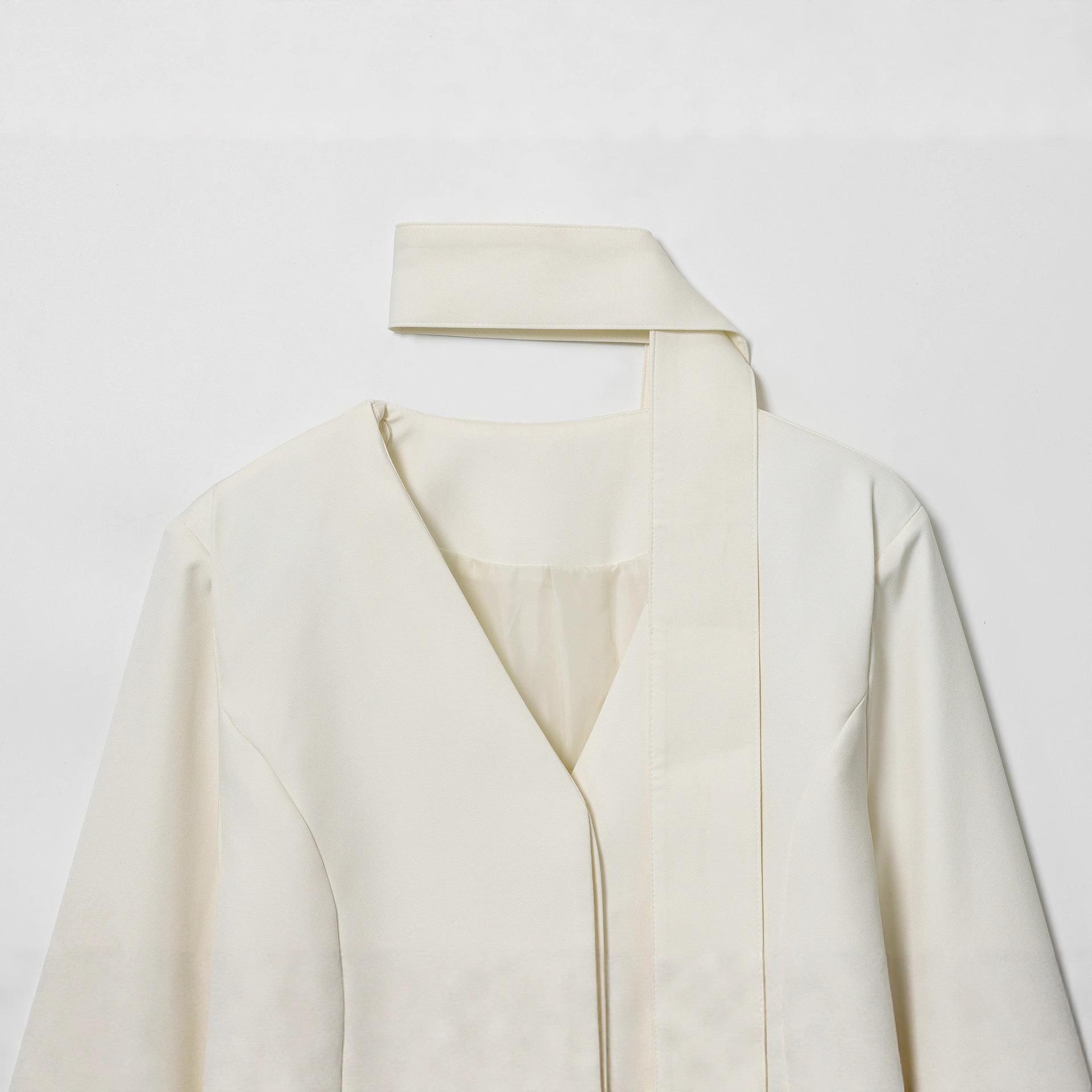 • Women Elegant V-Neck Suit Jacket With Scarf Collar Long Sleeve Polyester Blend Blazer For Office Party Casual Lady Style Cream White Short Outerwear