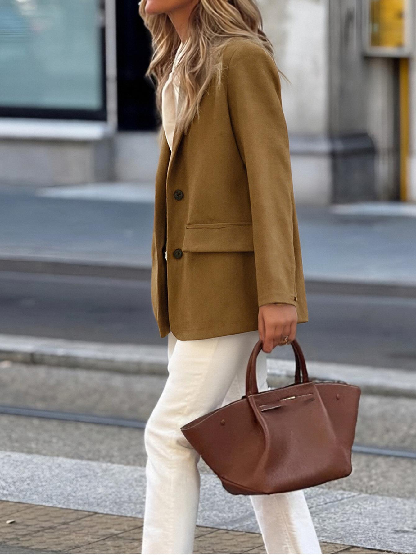 • Women Fashion Suede Blazer Notched Lapel Mid-Length Suit Jacket Two-Button Long Sleeve Temperament Commute Office Outerwear Coat For Women