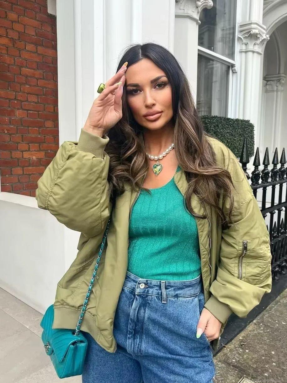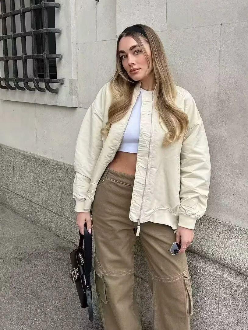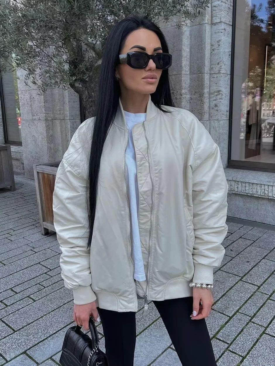 • Women Loose Flight Bomber Jacket Oversized Zip Up Pockets Solid Streetwear Outerwear Coat MA-1 Style Polyester Ribbed Cuffs Casual Long Sleeve Spring Fall Jackets
