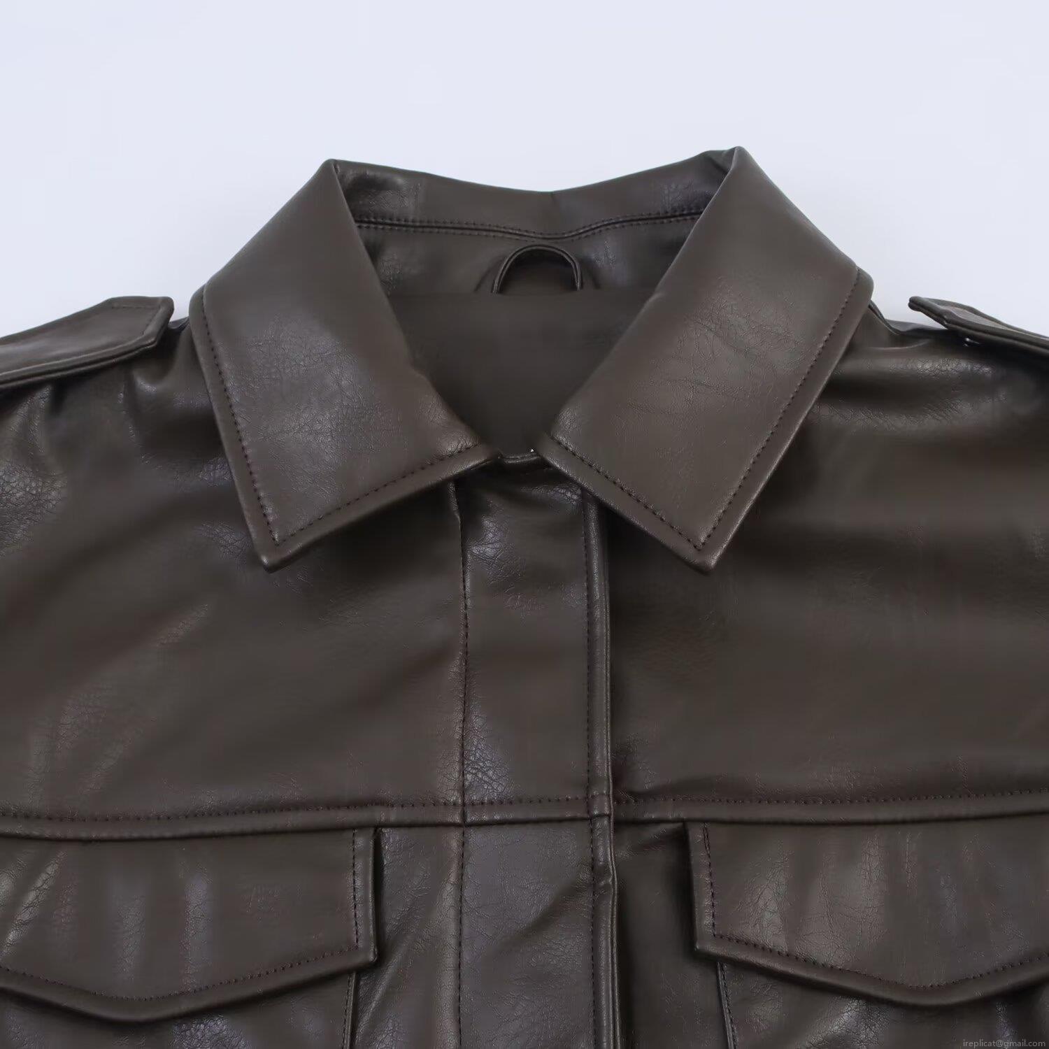 • Women PU Leather Jacket With Belt And Four Pockets Vintage Western Streetwear Faux Leather Coat Long Sleeve Outerwear Lapel Neck Coffee