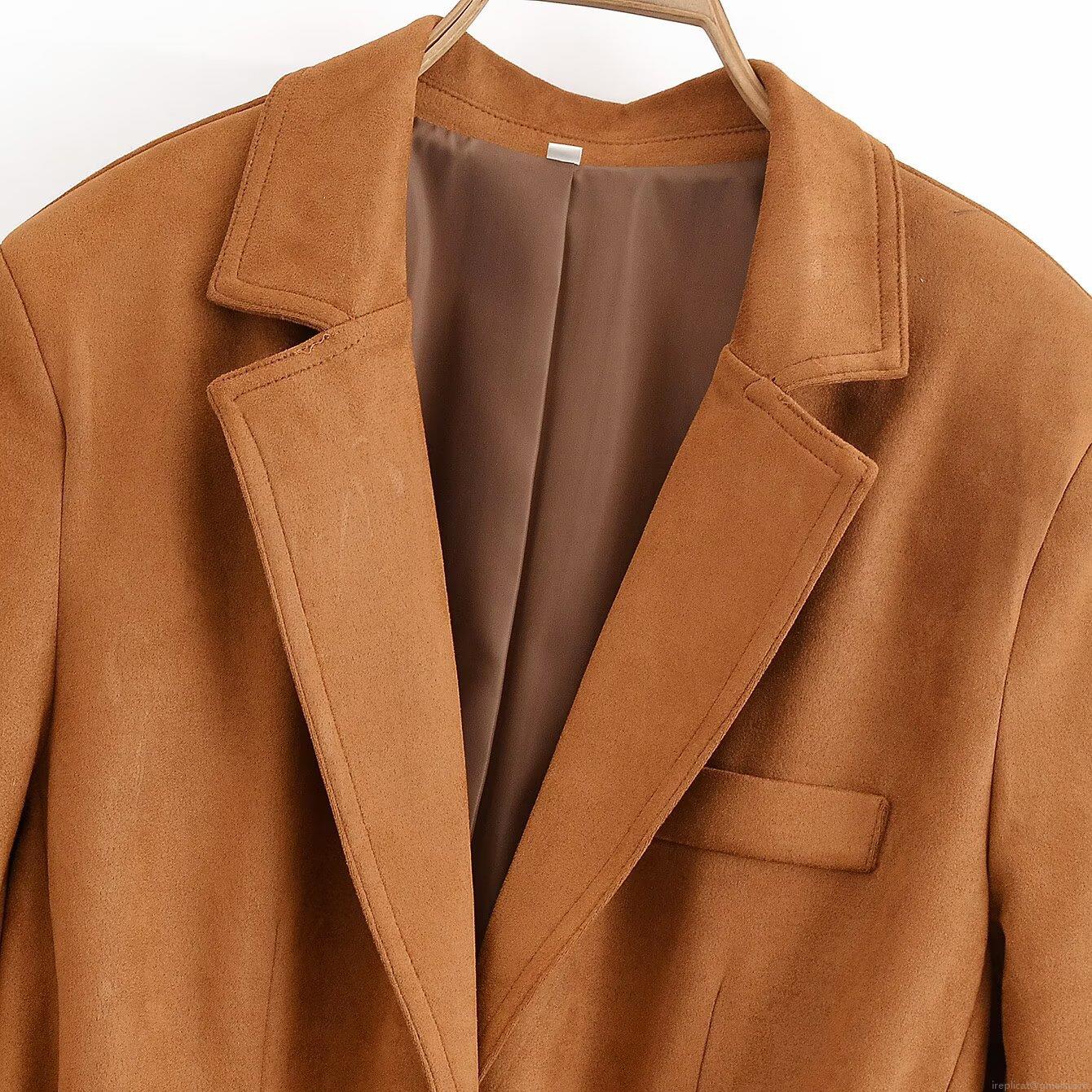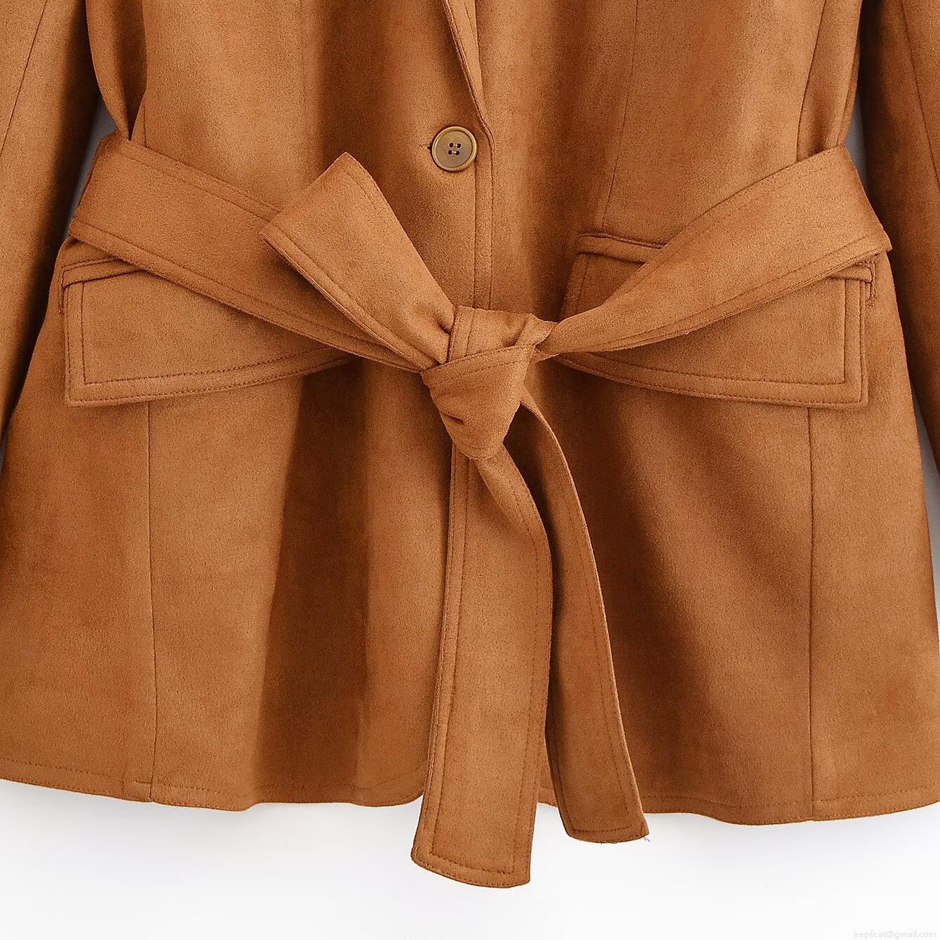 • Women Suede Suit Jacket With Belt Elegant Solid Color Long Sleeve Blazer Coat For Office Lady Work 100% Polyester Lining Commuter Style Chocolate Brown Autumn Outwear