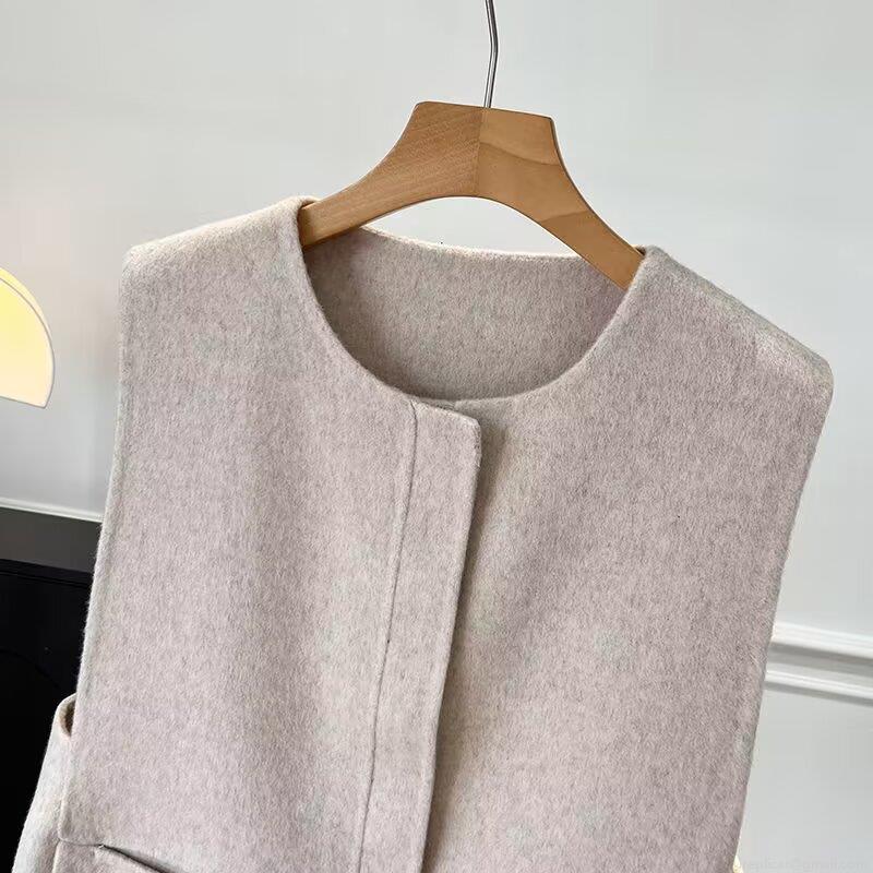 Women's Autumn Fashion Minimalist Sleeveless Woolen Blend Vest Round Neck Button Patchwork Solid Color Casual Cardigan Outerwear Waistcoat