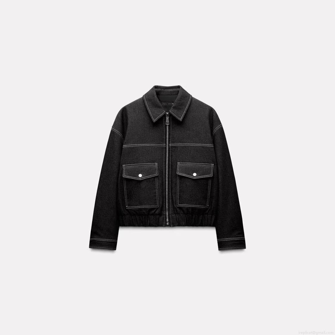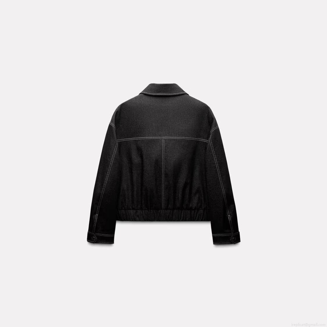 Women's Casual Loose Denim Jacket With White Contrast Stitching Pocket Zipper Workwear Style Black Cotton Blend Outerwear For Daily Streetwear Fall Spring