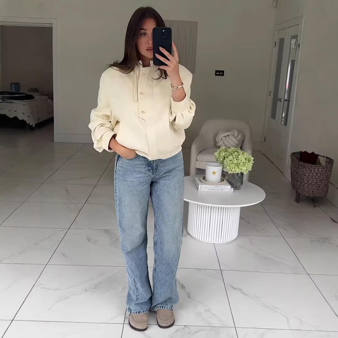 • Women's Casual Polyester Solid Color Stand Collar Jacket With Button Decoration Zip Up Long Sleeve Outerwear For Daily Spring Autumn Women