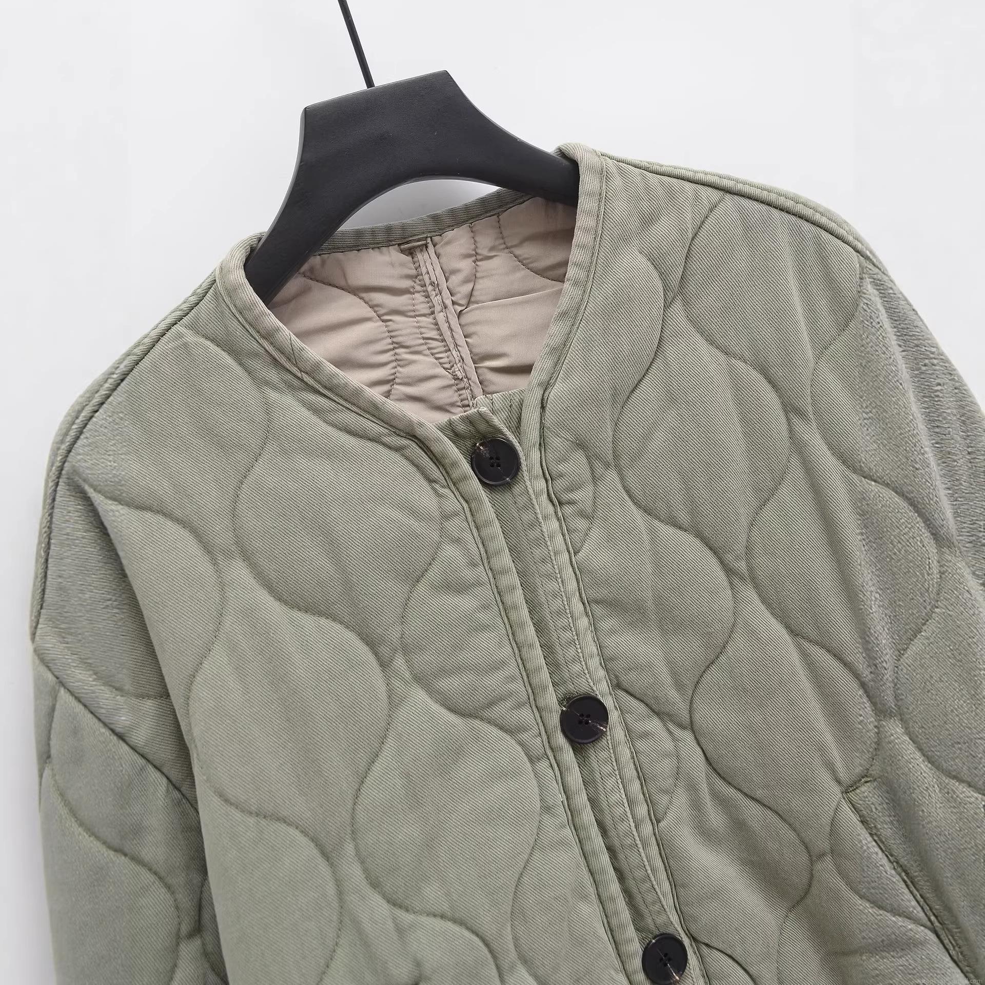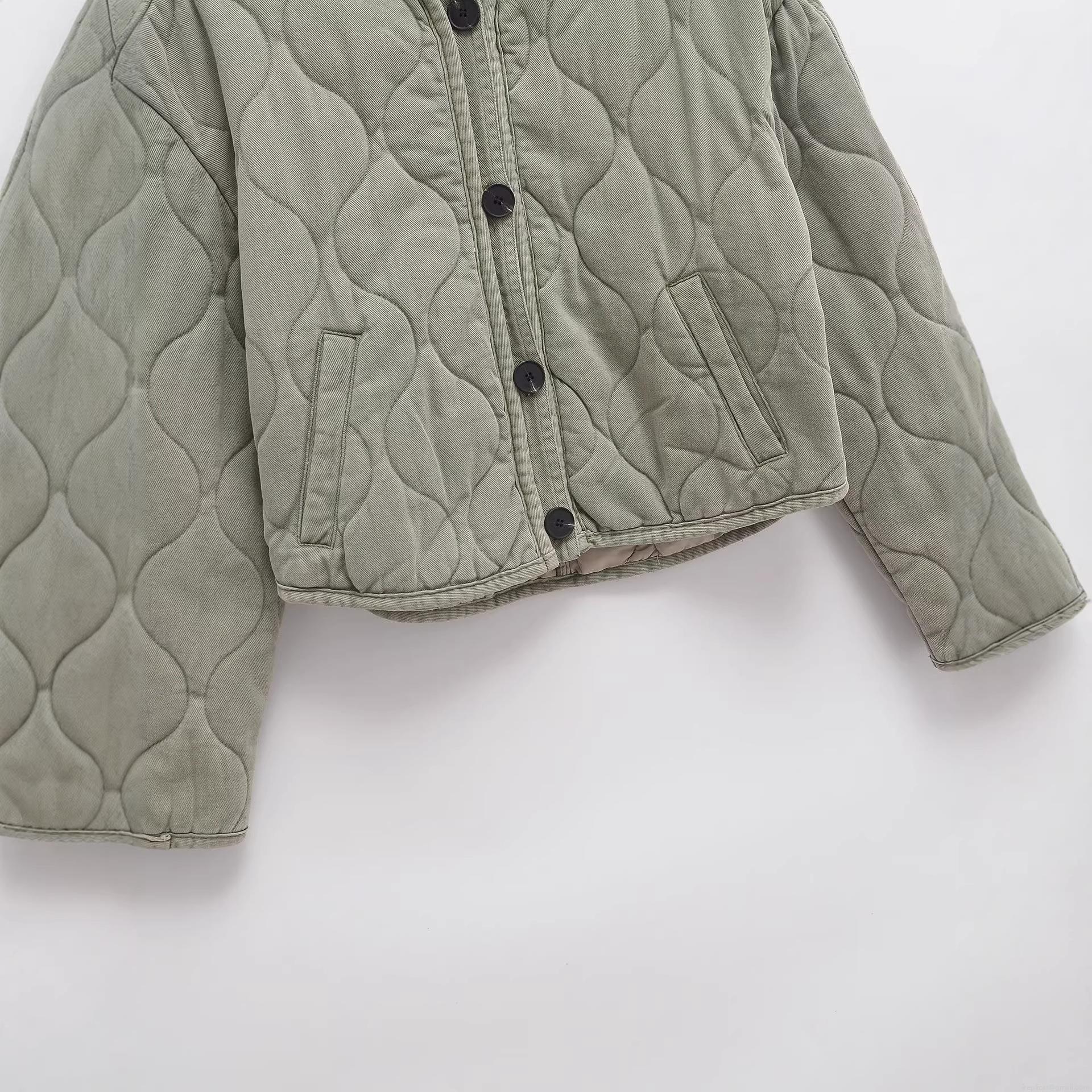 • Women's Casual Quilted Jacket Lightweight Sage Green Round Neck Long Sleeve Puffer Coat Solid Color Button Up Outerwear For Winter Fall
