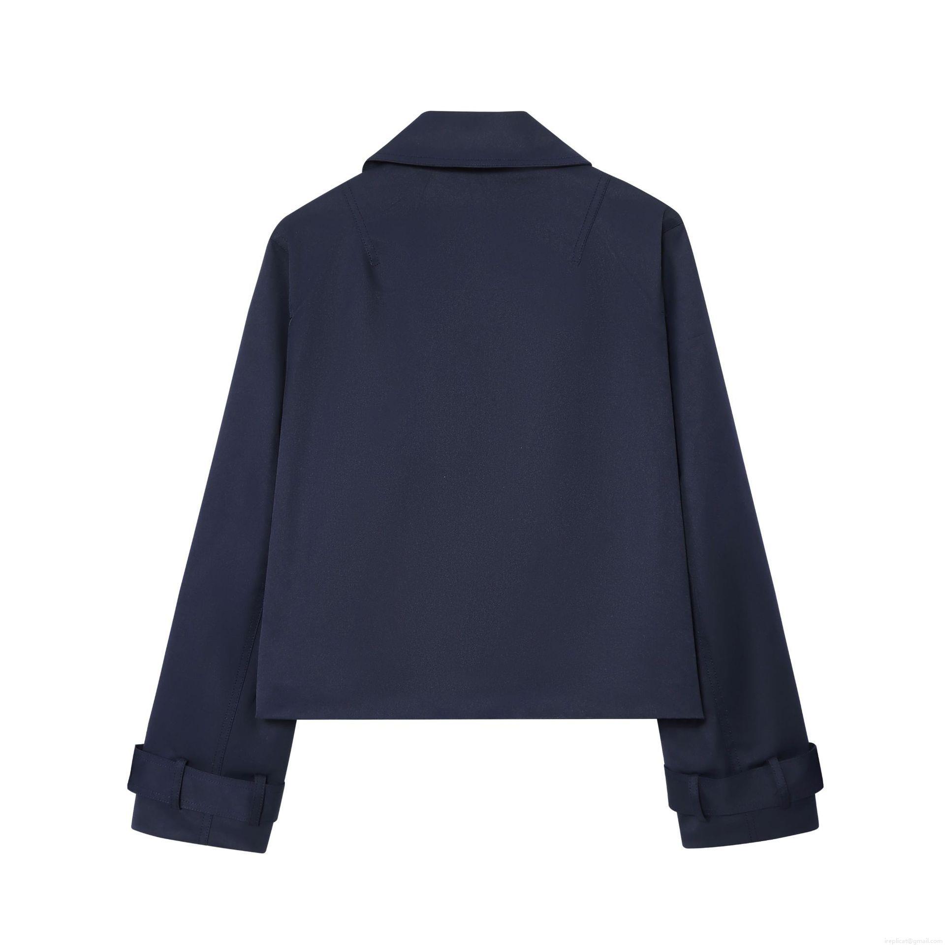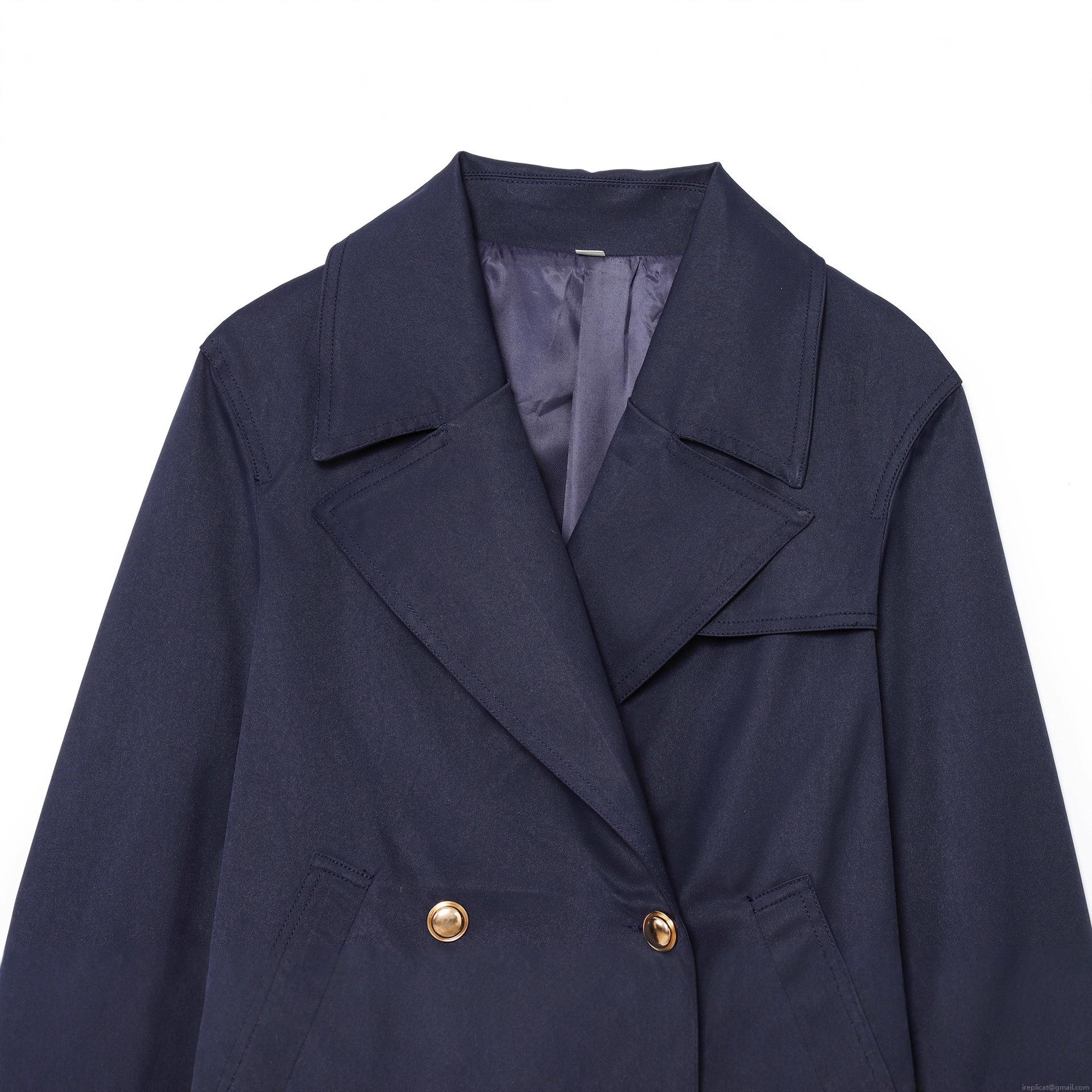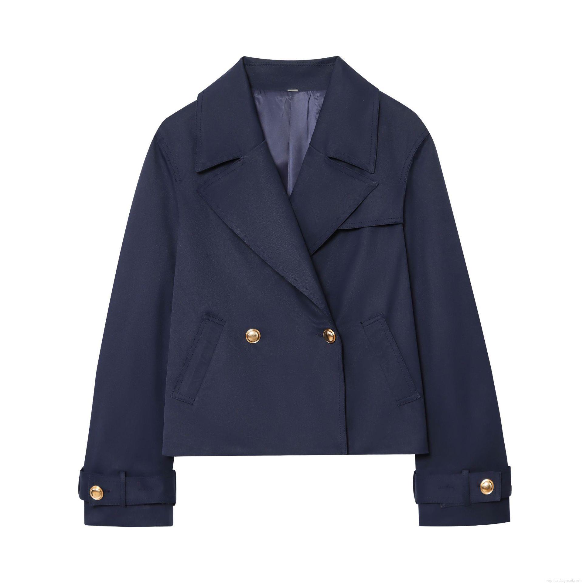 Women's Double Breasted Short Trench Jacket Navy Blue Polyester Coat with Gold Metal Buttons Elegant Office Lady Outerwear