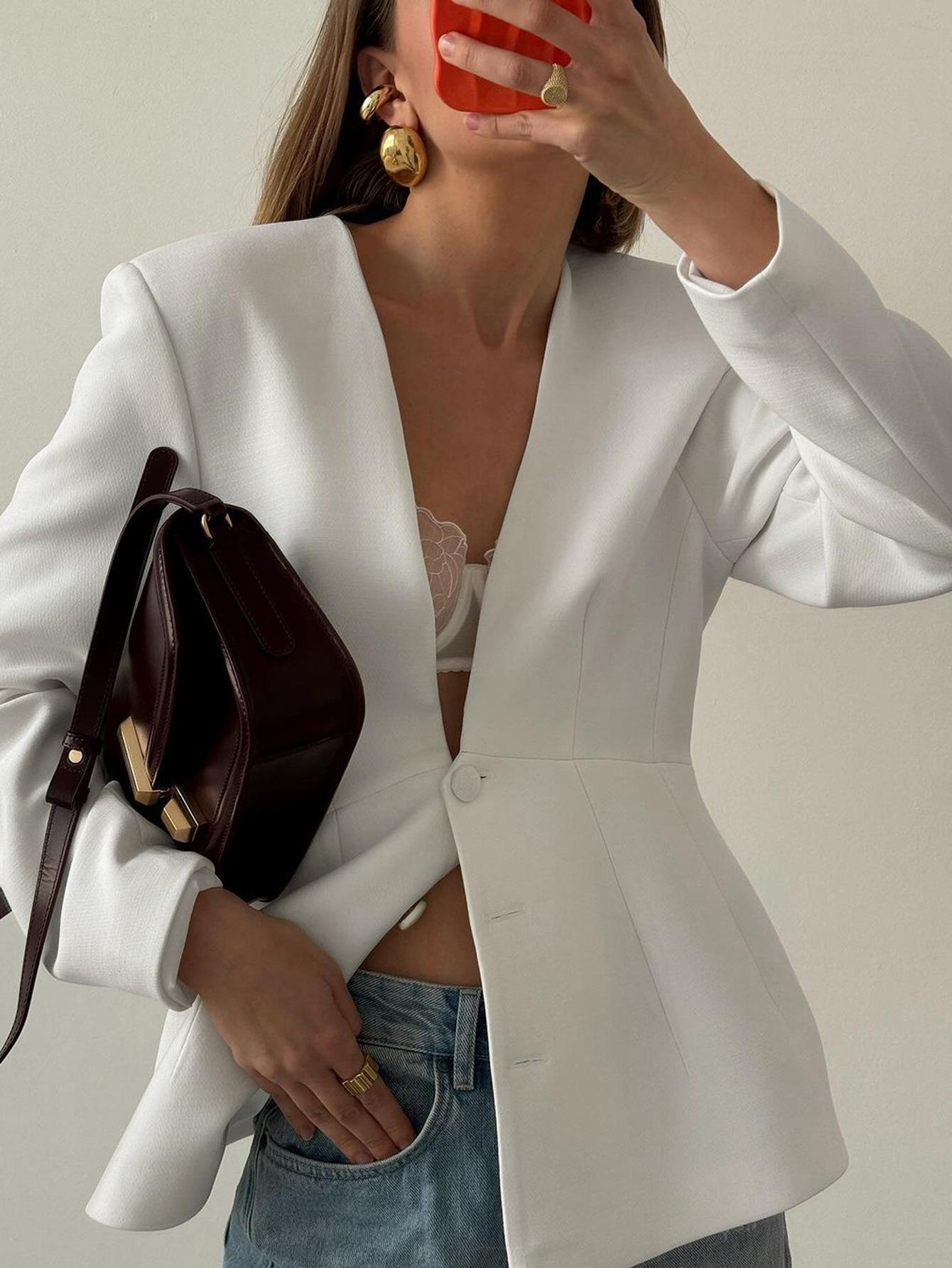 Solid Color, Waist shaping, Shoulder Pads, Single-breasted, Deep V-neck