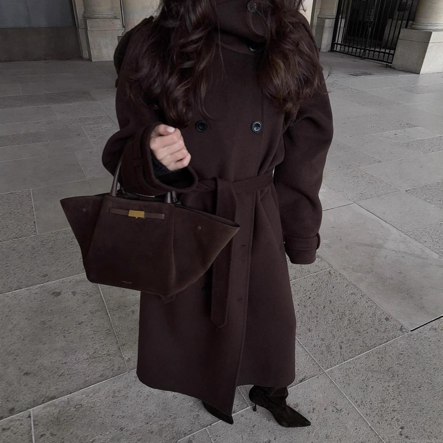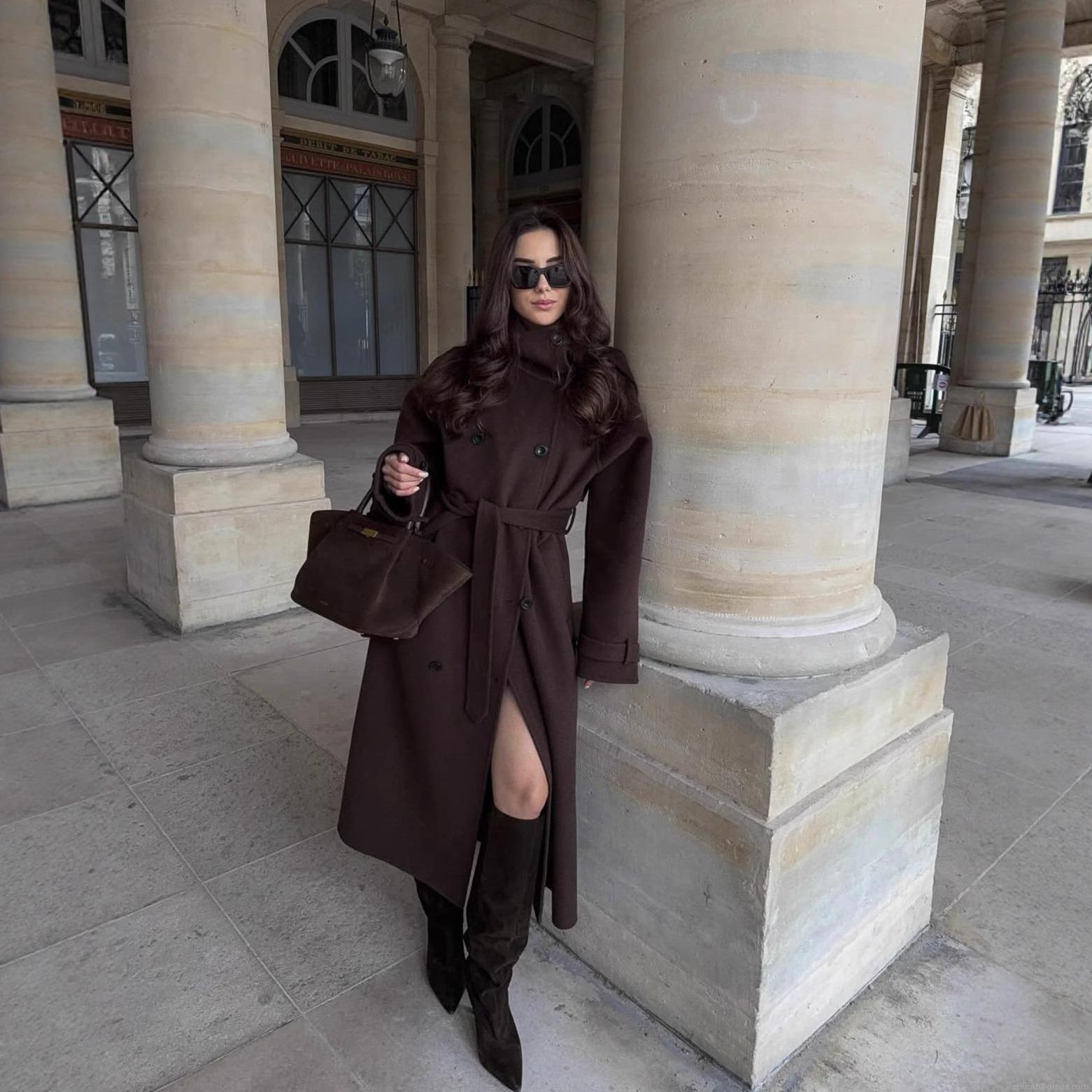 Women's Elegant Long Woolen Trench Coat Double Breasted Lapel Belted Overcoat Winter Autumn Fashion Warm Casual Slim Fit Outerwear Long Sleeve Solid Jacket