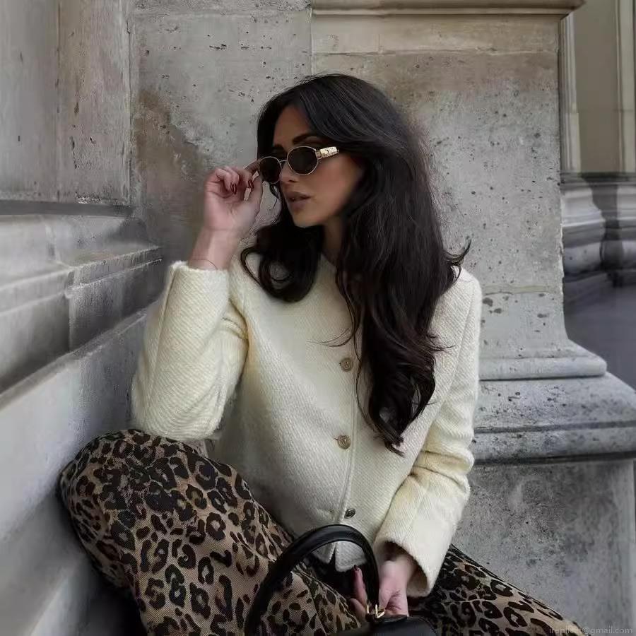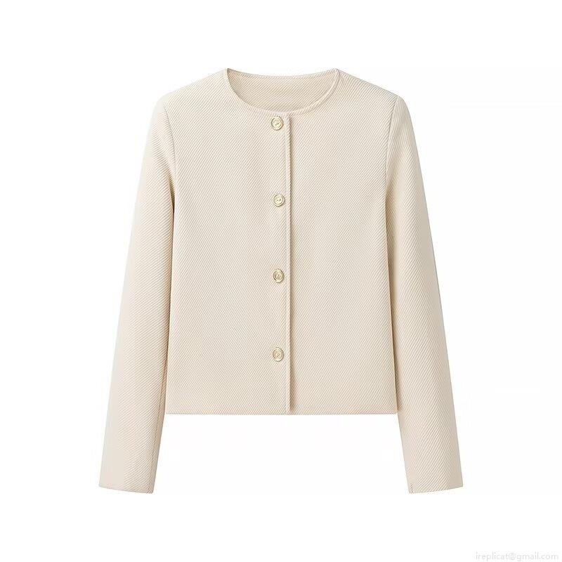 • Women's Elegant Tweed Short Jacket French Style Round Neck Solid Ivory White Coat With Gold Buttons For Autumn Winter Daily Wear