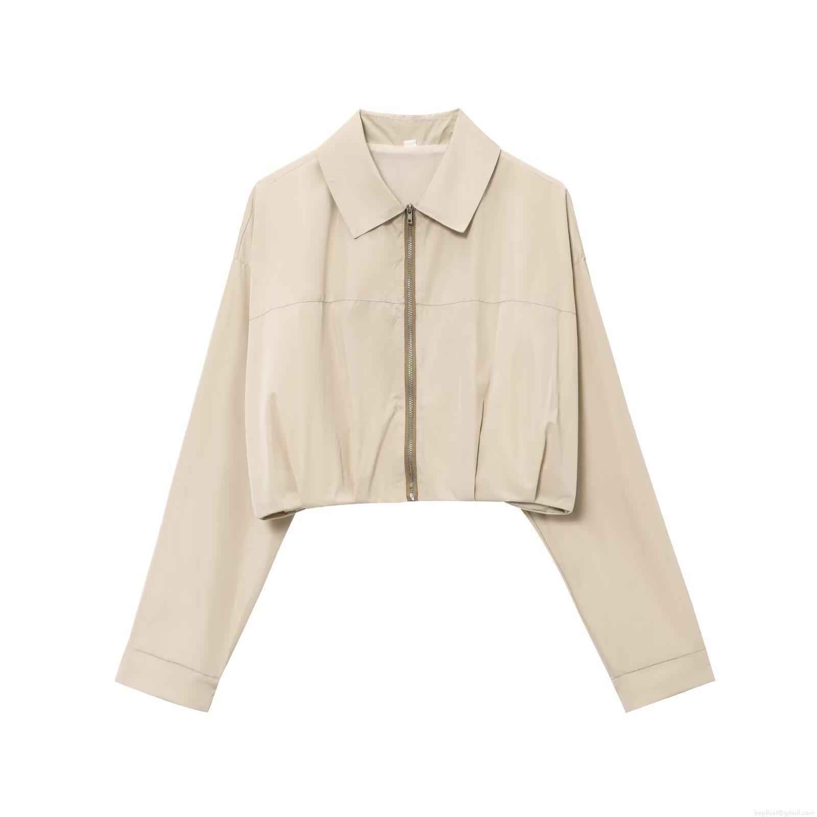 Women's Fashion Cropped Jacket Long Sleeve Lapel Zipper Up Short Outwear Solid Color Casual Pleated Coat For Spring Autumn