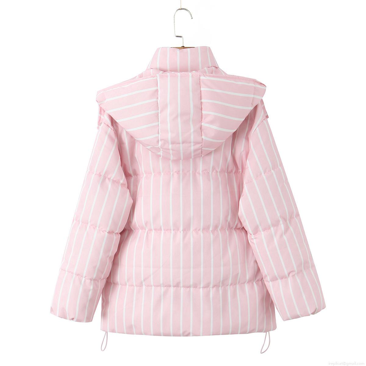 • Women's Fashion Pink White Vertical Stripe Hooded Puffer Jacket Winter Warm Quilted Cotton Padded Coat With Zipper Drawstring Hem For Women Daily Outwear