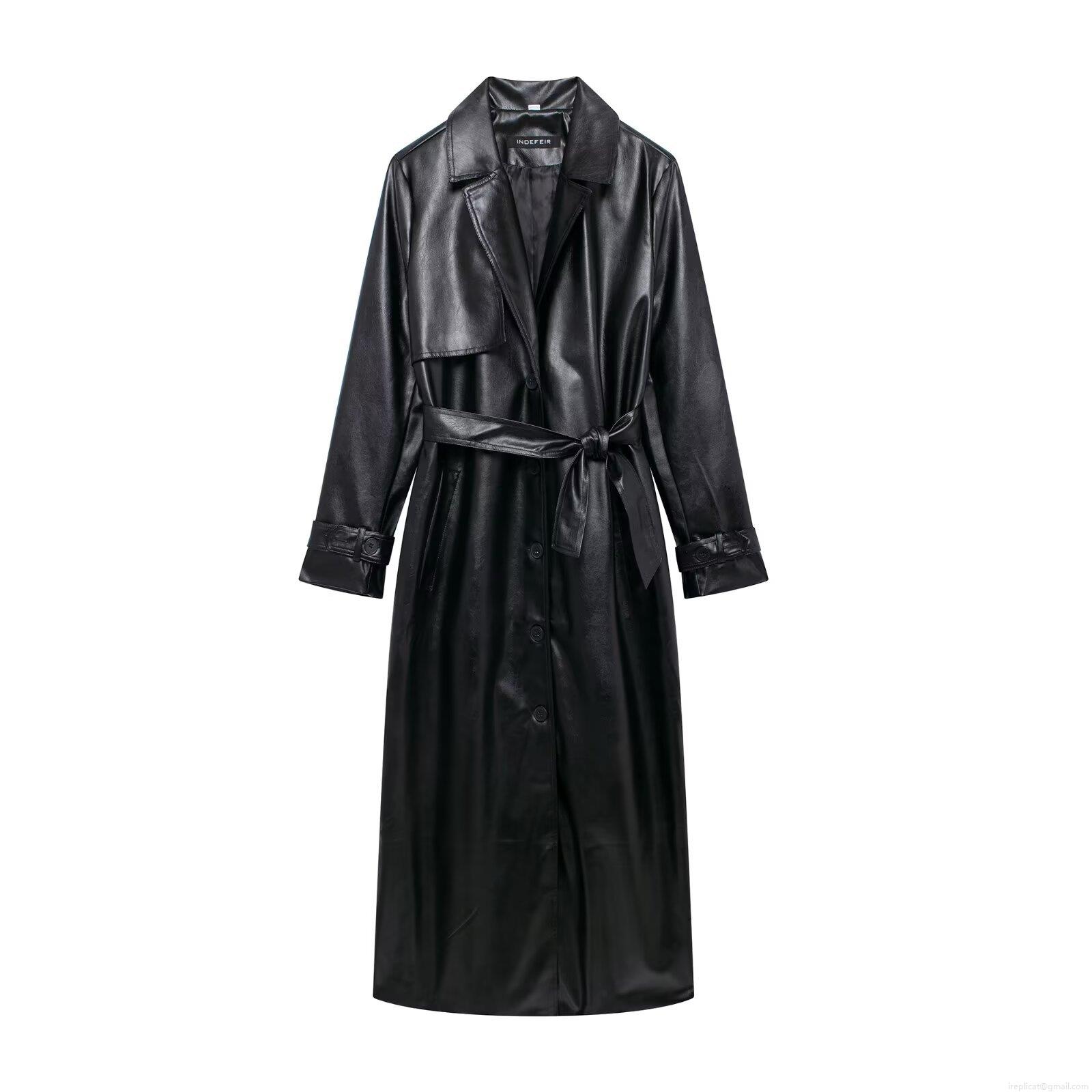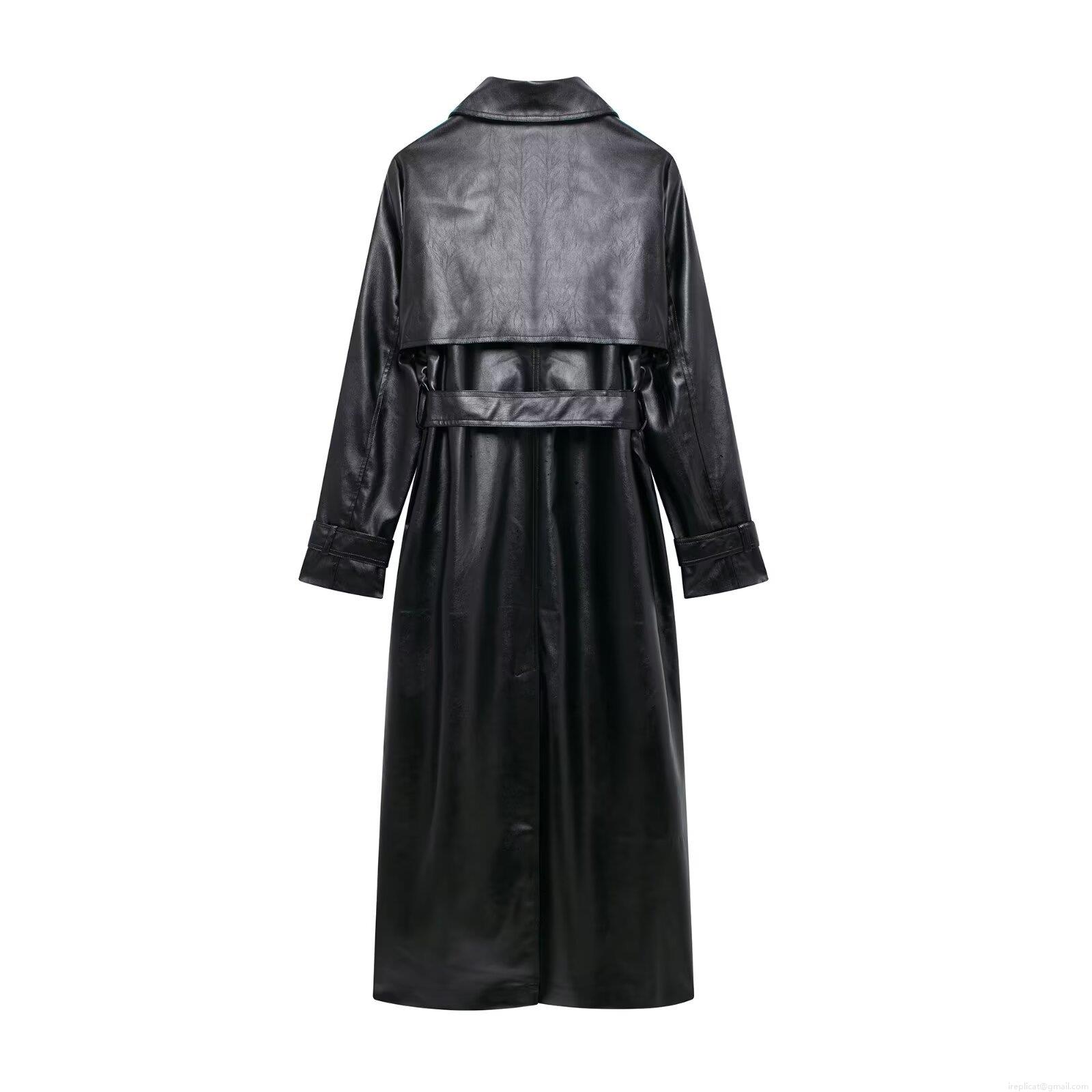 • Women's Loose PU Faux Leather Trench Coat With Belt Long Sleeve Lapel Solid Color Maxi Windbreaker Autumn Streetwear Fashion Outwear Jacket