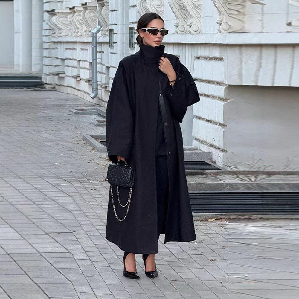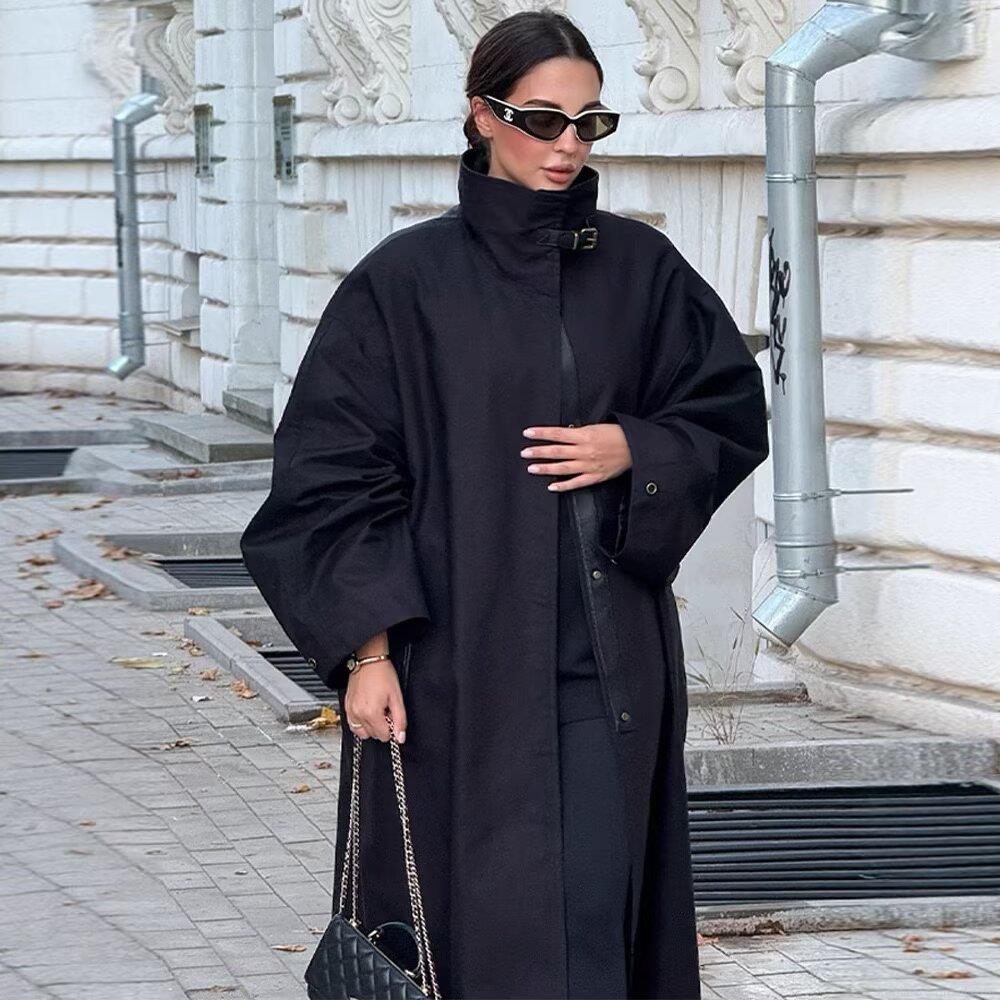 • Women's Matrix Style Stand Collar Black Extra Long Trench Coat Loose Fit Polyester Winter Overcoat With Leather Strap Detail Elegant Lady Streetwear Windbreaker Jacket
