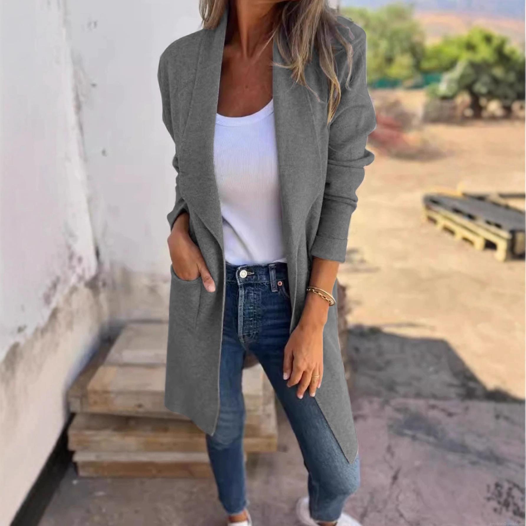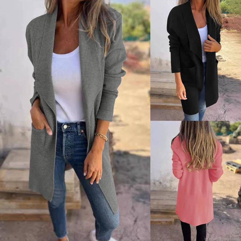 • Women's Plus Size Lapel Cardigan Coat Long Sleeve Mid-Length Casual Solid Jacket With Pockets Polyester Spandex Outerwear For Autumn Winter