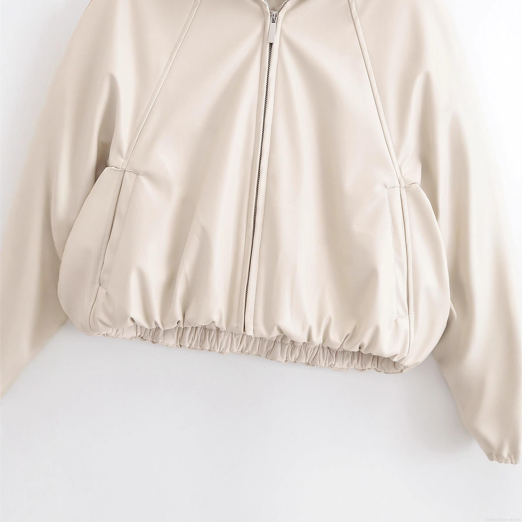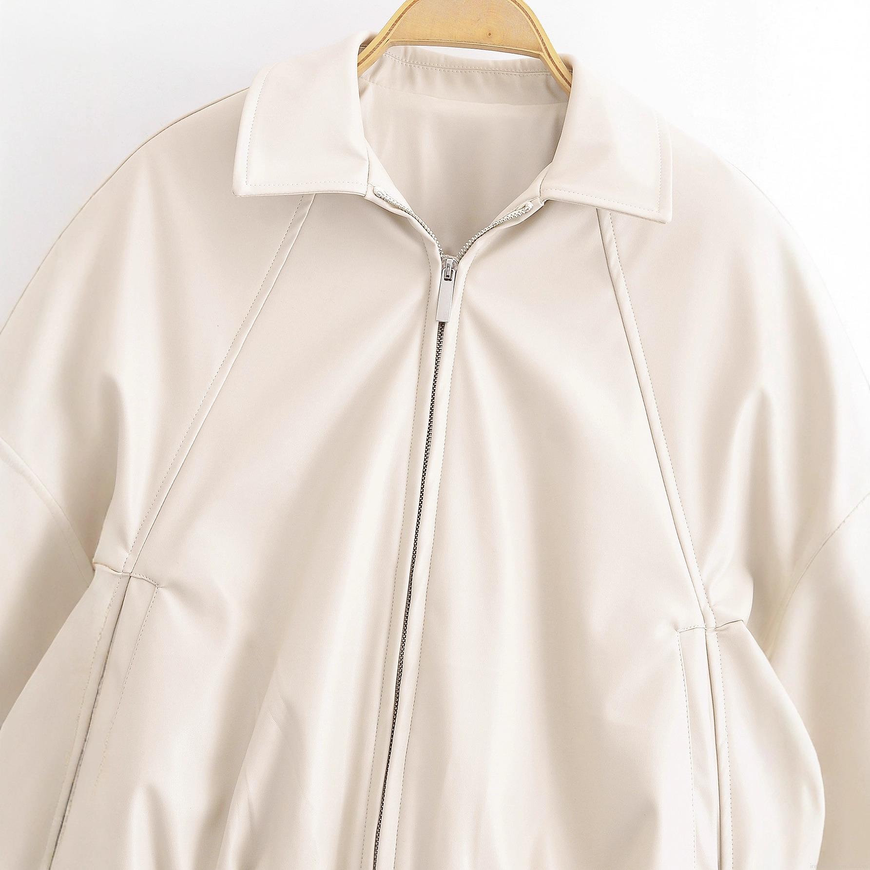 • Women's PU Leather Jacket Lapel Long Sleeve Loose Fit Motorcycle Coat Beige Solid Color Zip Up Short Outerwear With Pockets Streetwear Casual Jacket For Women