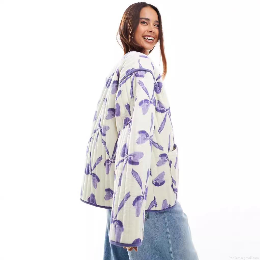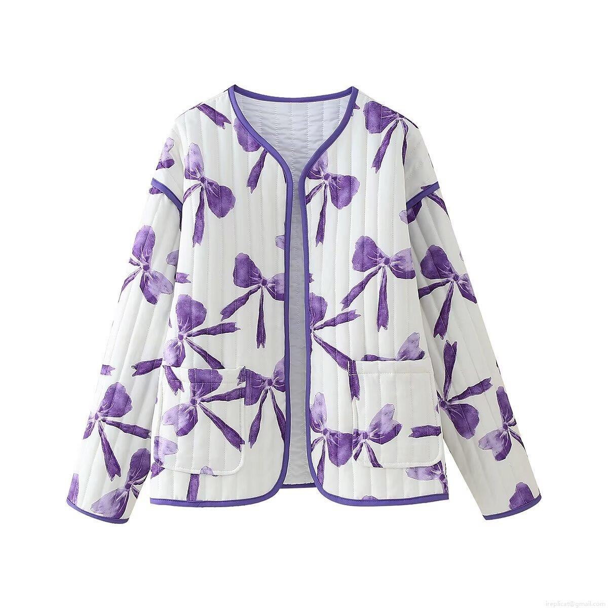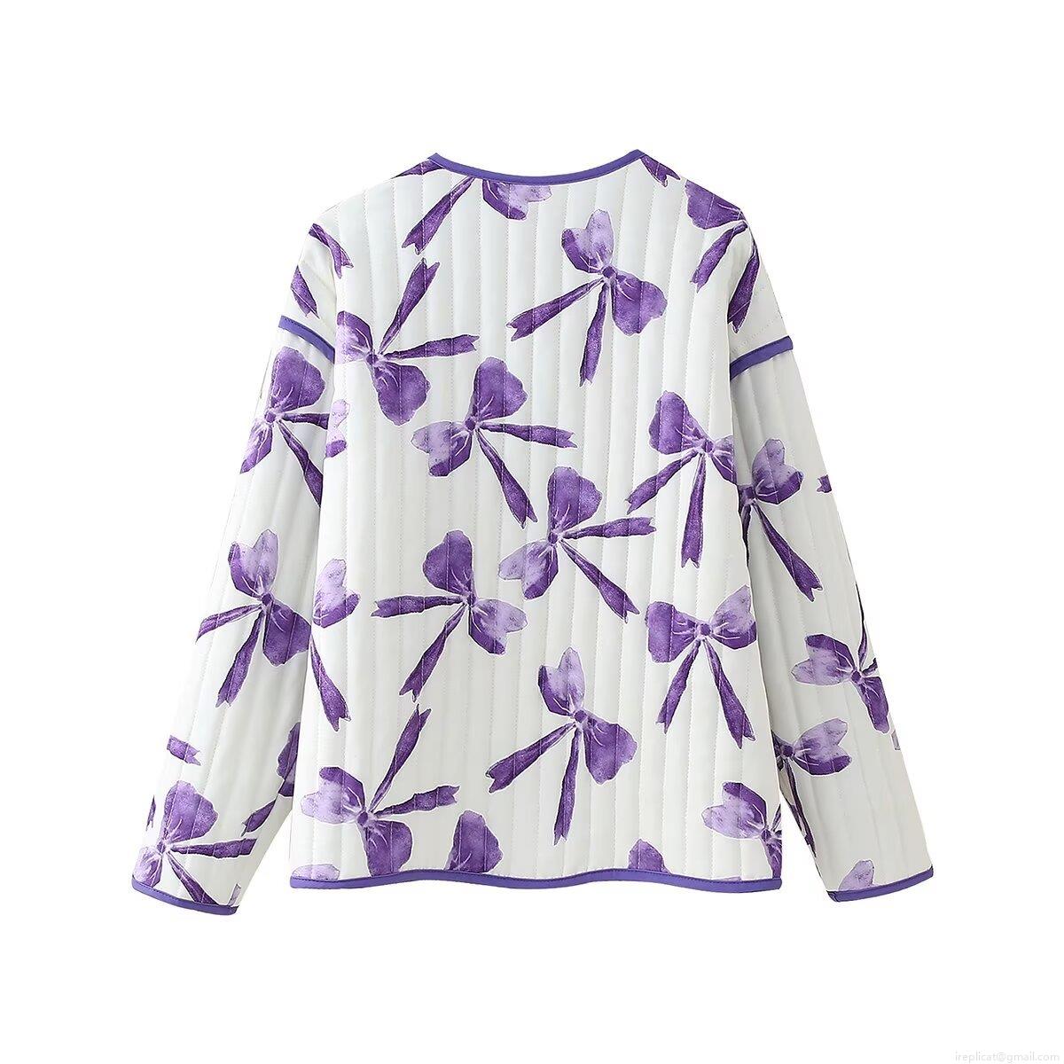 • Women's Quilted Cotton Jacket 100% Polyester Cute Bow Print Puffer Coat Loose Warm Outerwear With Purple Trim For Daily Casual Sweet Style