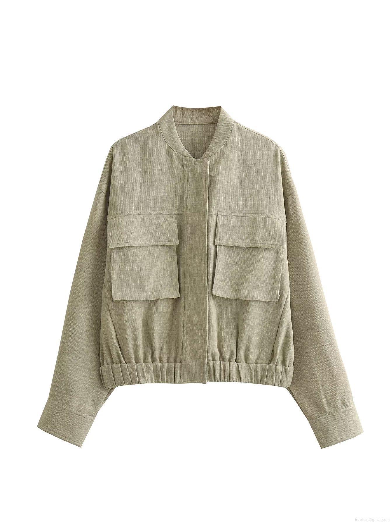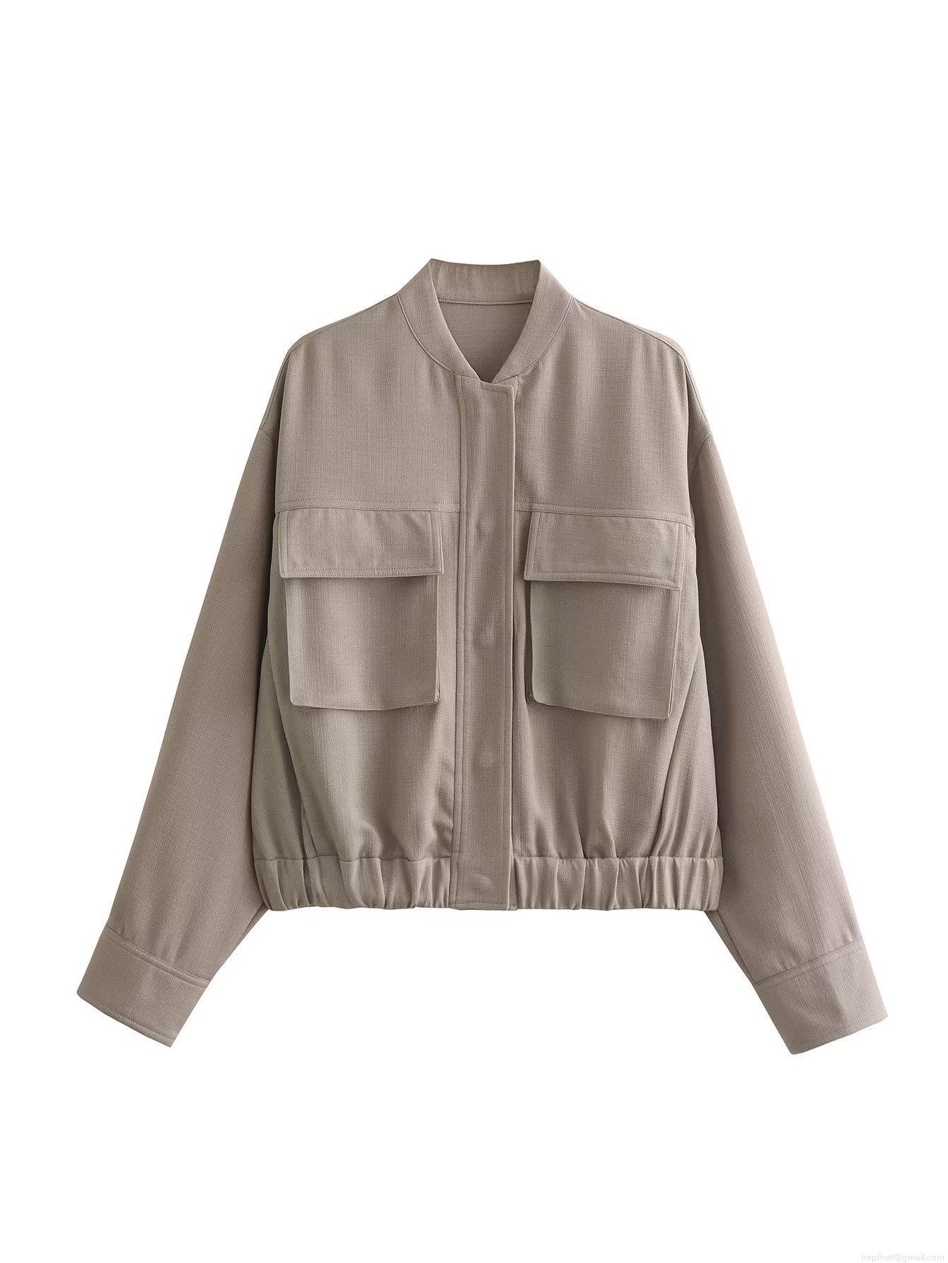• Women's Utility Jacket Cotton Linen Blend Lightweight Short Coat With Large Pockets Stand Collar Elastic Hem Y2K Streetwear Casual Outerwear For Women