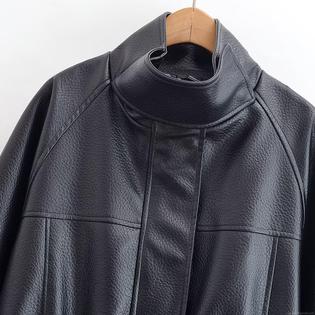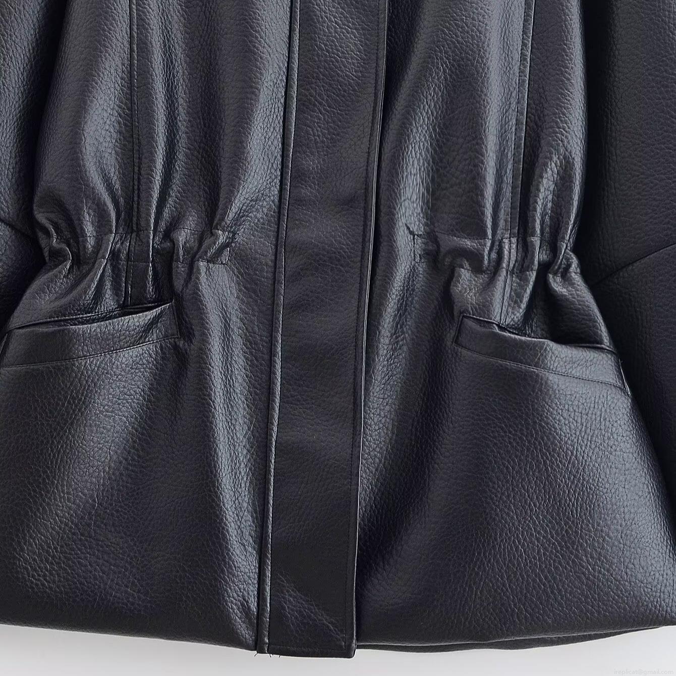 • Women's Winter Fashion Black PU Leather Jacket Mid-Length Stand Collar Adjustable Waist Faux Leather Coat With Pockets Windproof Loose Fit British Style Outerwear