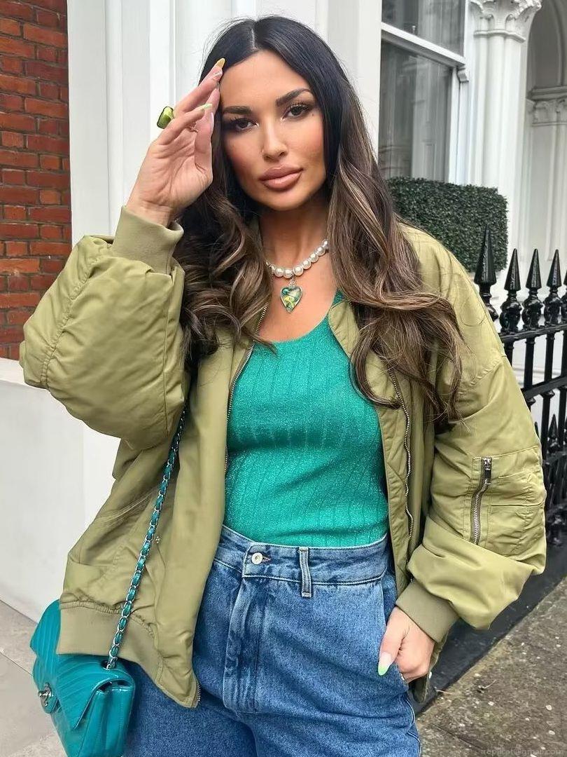 Women's Y2K American Retro Oversized Bomber Jacket 100% Polyester Windproof MA-1 Pilot Coat With Contrast Orange Lining Zip-Up Streetwear Jacket For Ladies