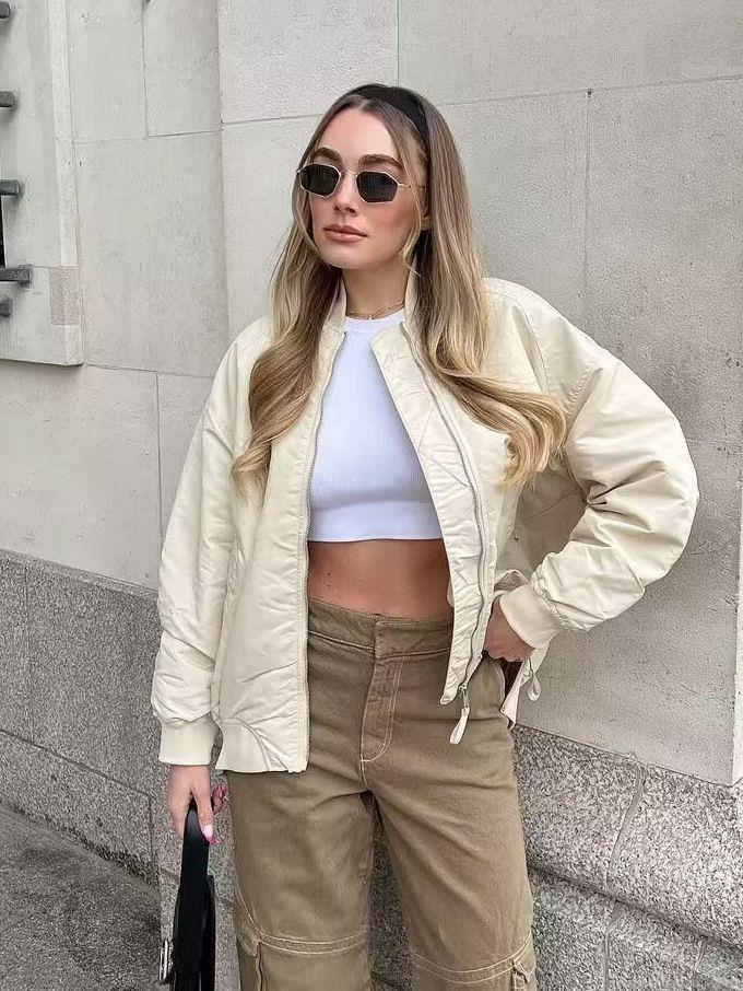• Women's Y2K American Retro Oversized Bomber Jacket 100% Polyester Windproof MA-1 Pilot Coat With Contrast Orange Lining Zip-Up Streetwear Jacket For Ladies