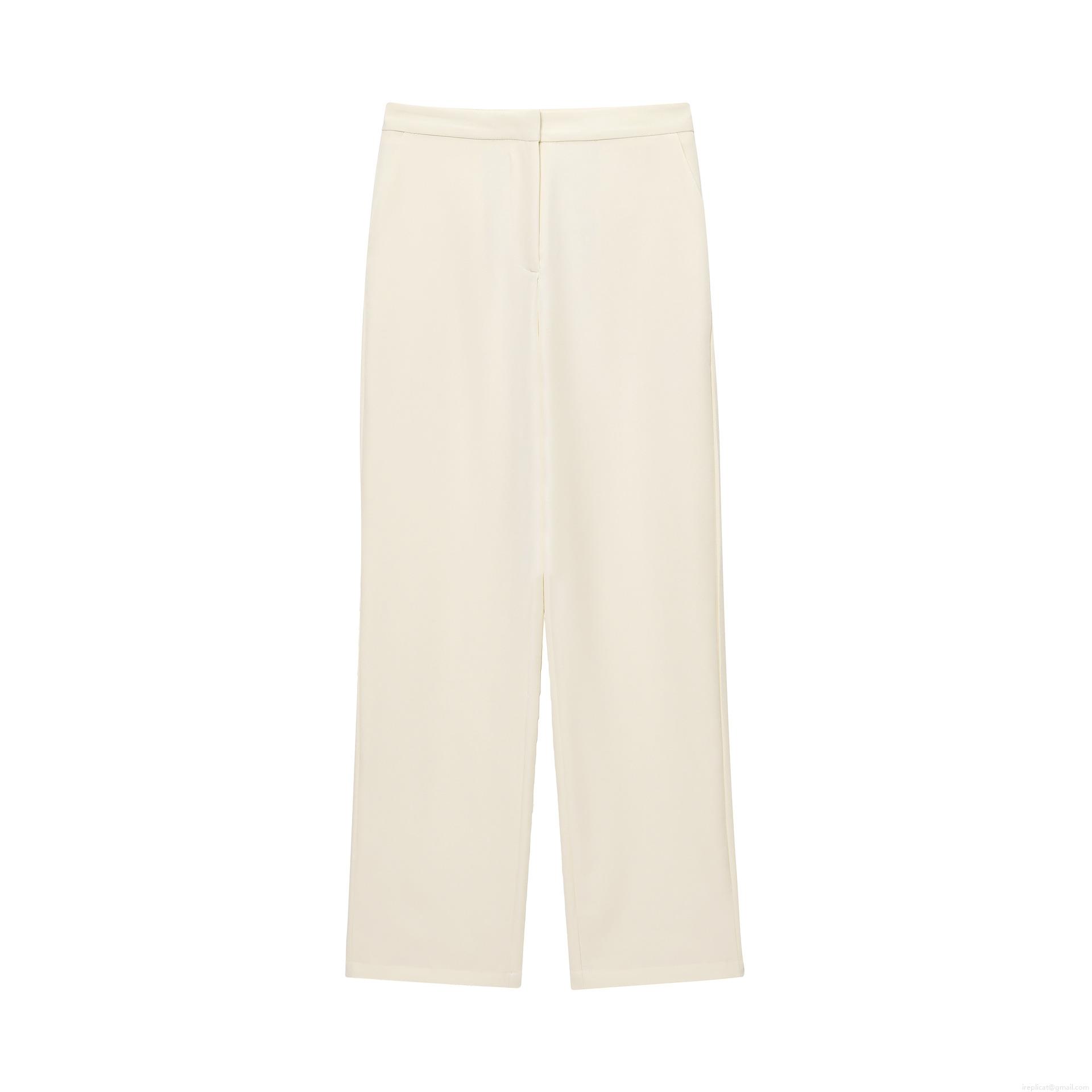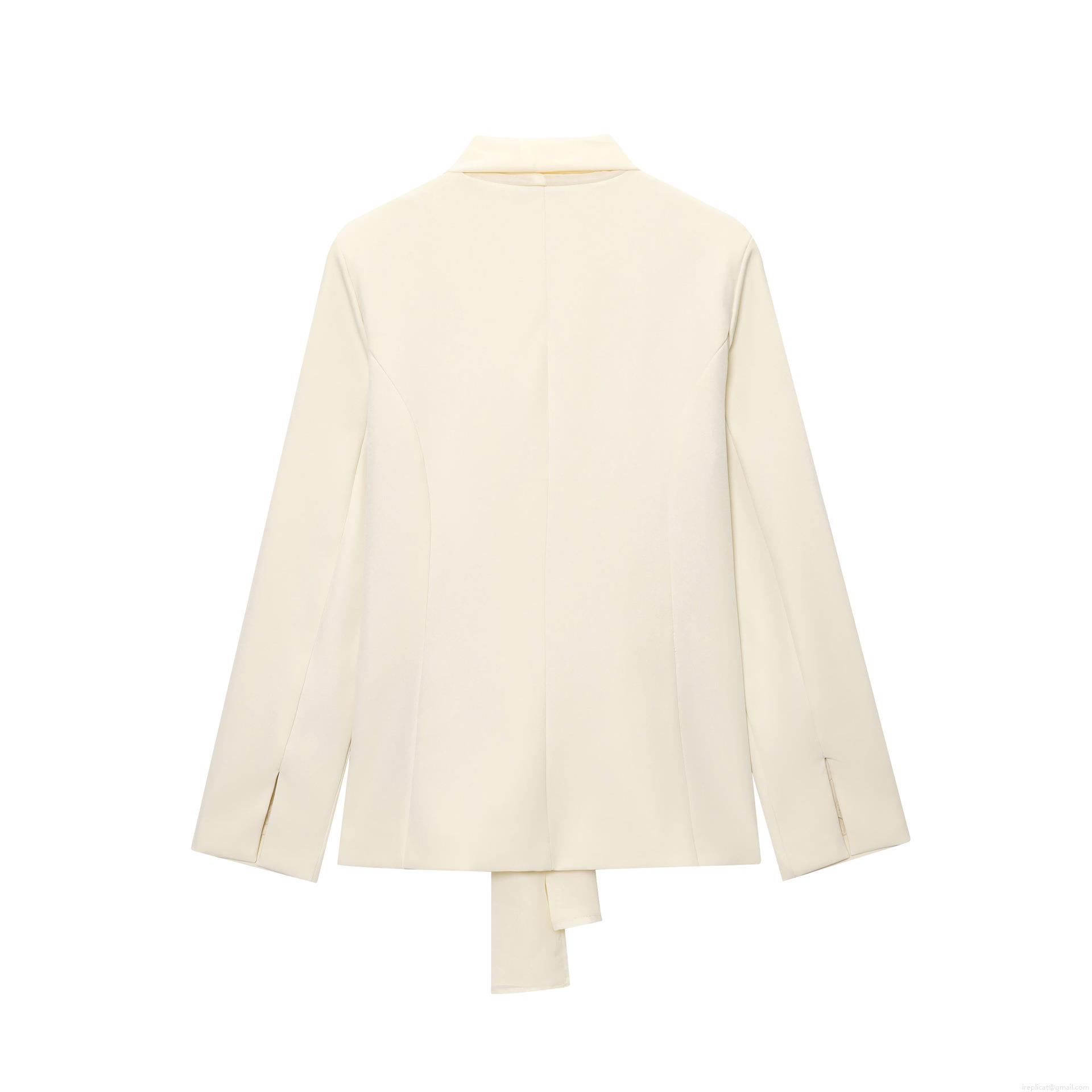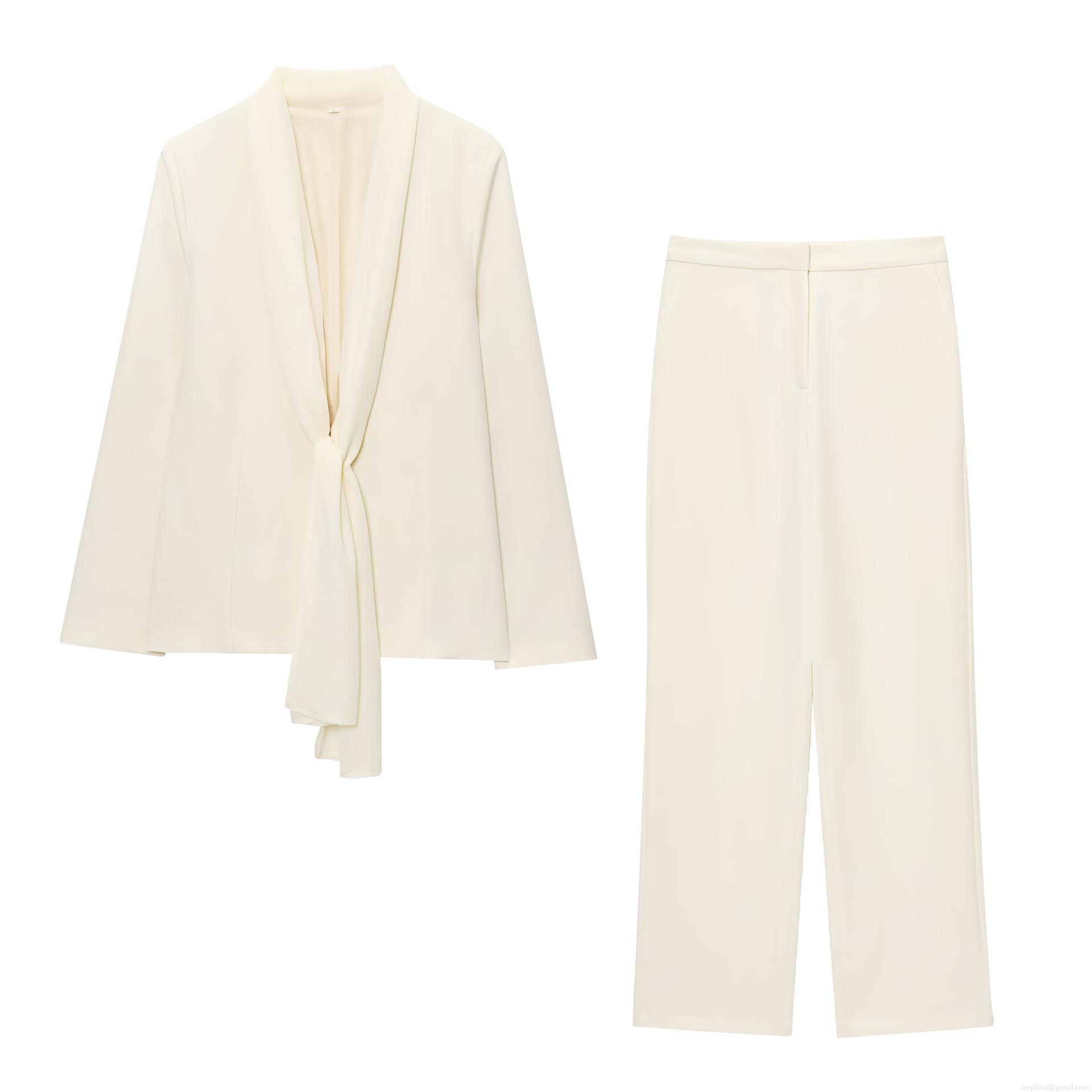 • Elegant Cream Women's Blazer And Straight Leg Pants Set Polyester Tie Collar Office Suit Professional Casual Two Piece Outfit Solid Color Streetwear For Women