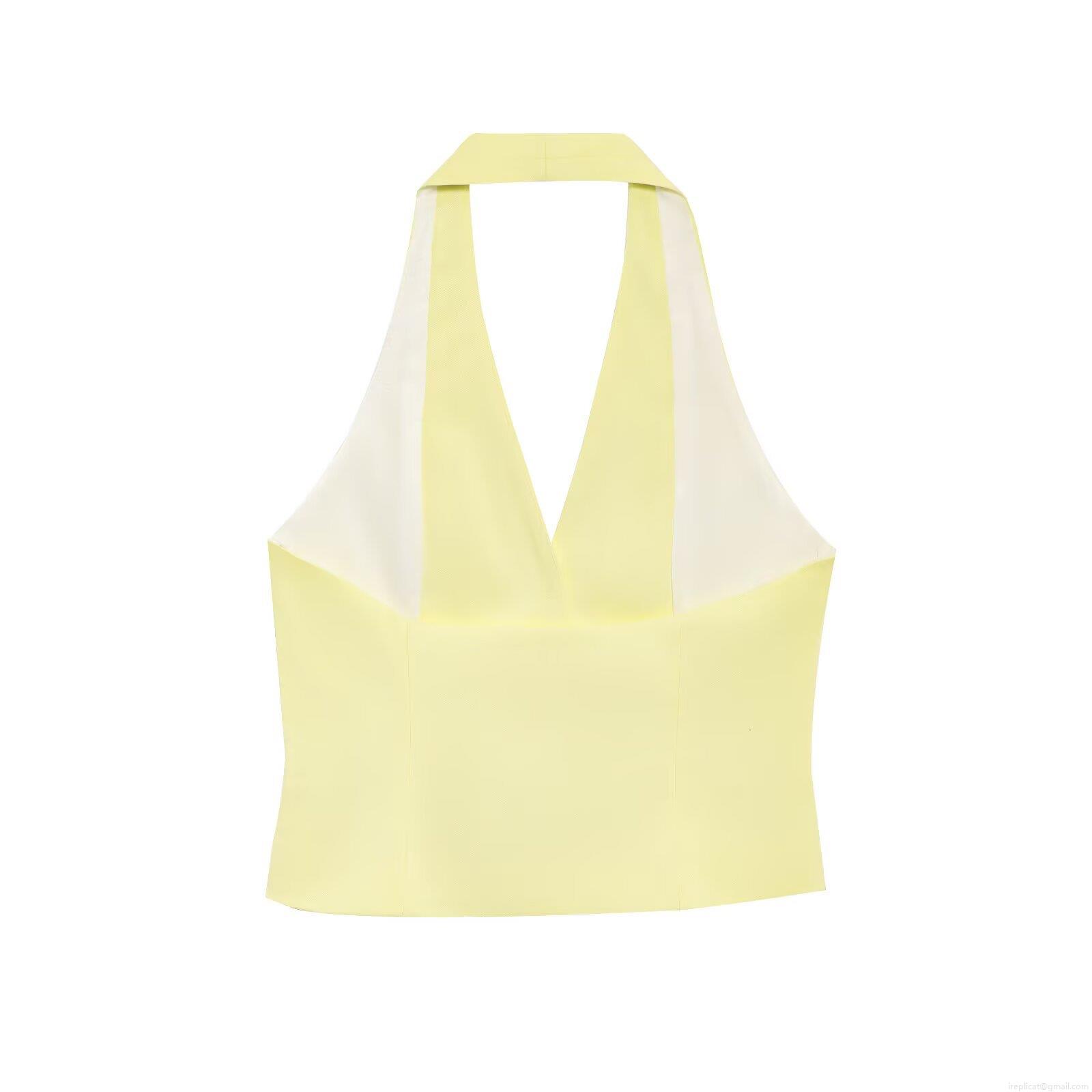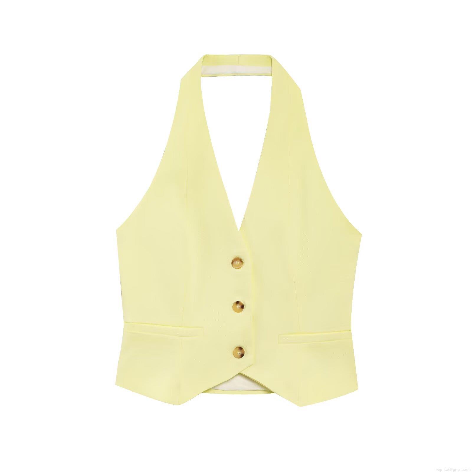 • Elegant French Style Women's Two Piece Set Halter Neck Button Vest Top And High Waist Wide Leg Pants Polyester Fine Twill Solid Color Casual OL Suit For Summer Autumn