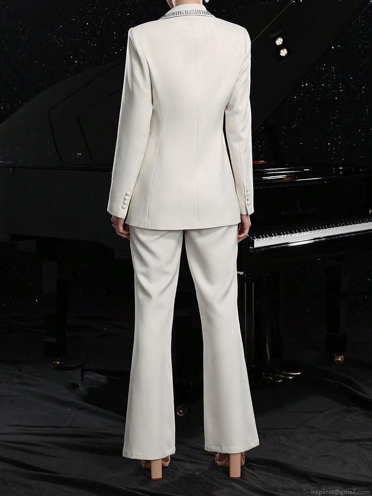 • Elegant White Two Piece Women Suit Set Hollow Out Blazer With Rhinestone Trim And High Waist Wide Leg Trousers For Office Party Wedding