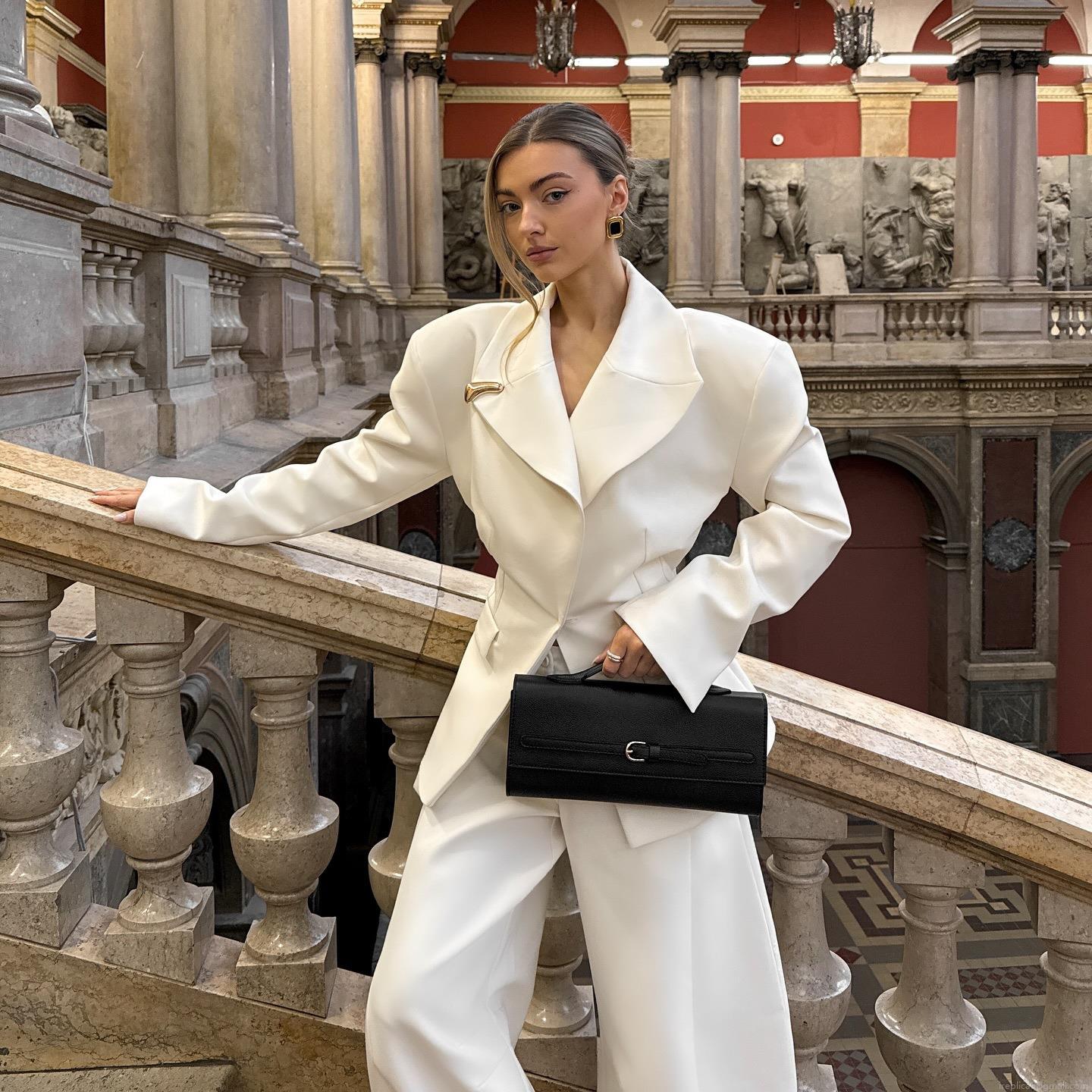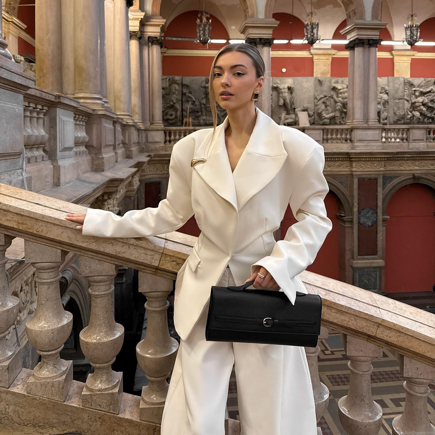 • Elegant White Women's Blazer Pants Set Broad Shoulder Slim Fit Single Breasted Suits With Wide Leg Trousers Fashion Office Lady Two Piece Outfits
