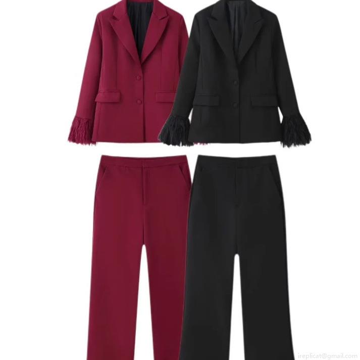 • Elegant Women Notched Lapel Blazer and Straight Leg Pants Set with Faux Feather Cuffs Solid Color Commuter Suit Two Piece Outfit For Office Party