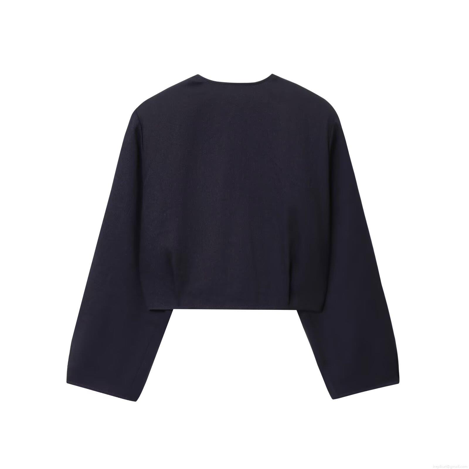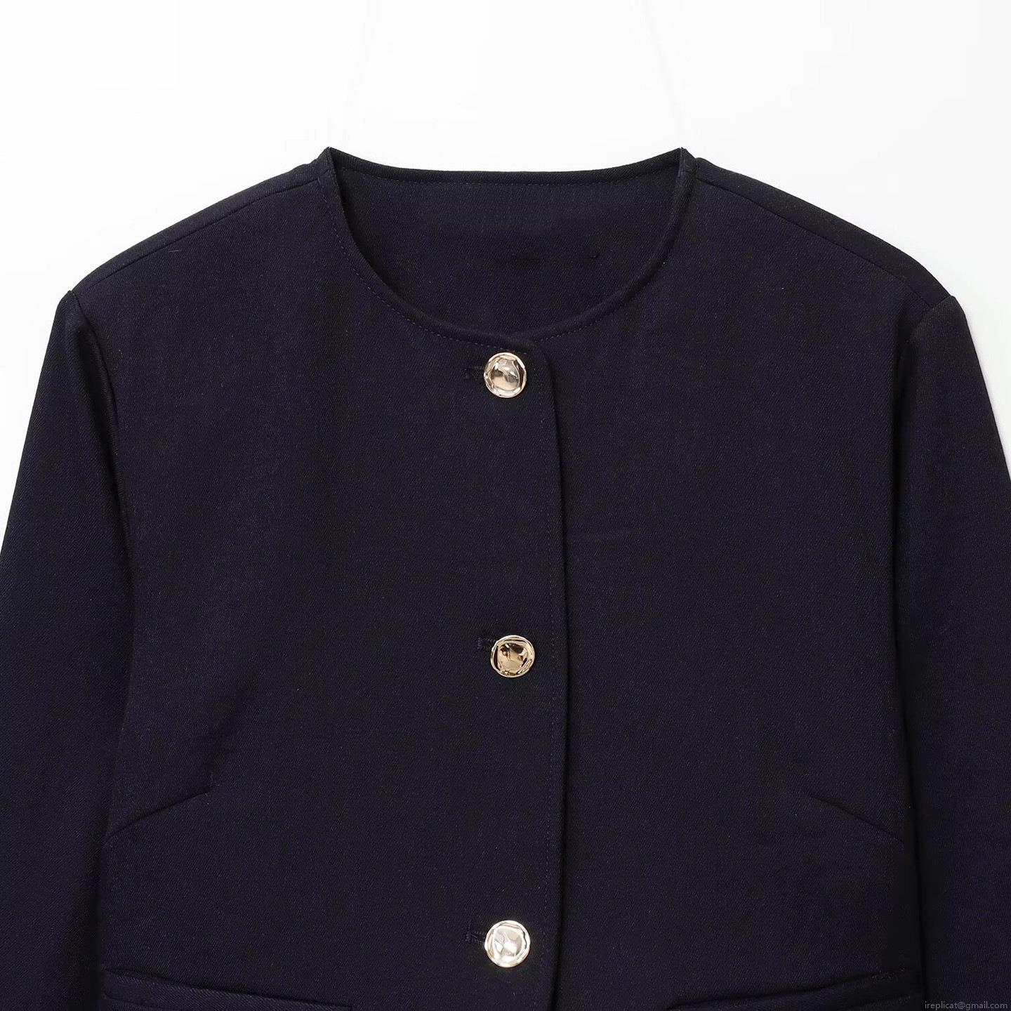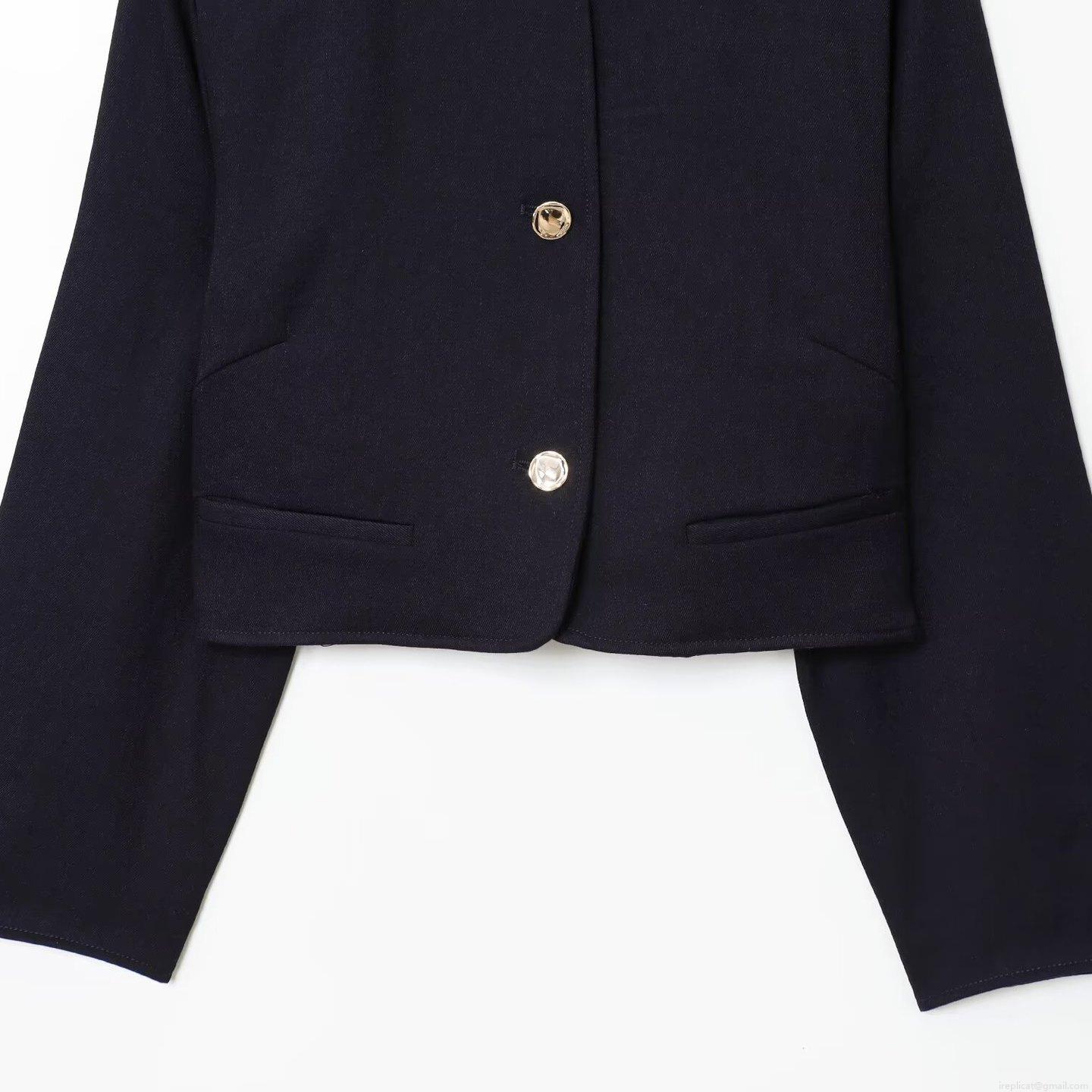 • Elegant Women Office Two Piece Set Navy Blue Cropped Round Neck Blazer Jacket With Gold Buttons And Belted Shorts Set Professional Business Casual Twill Suit For Ladies