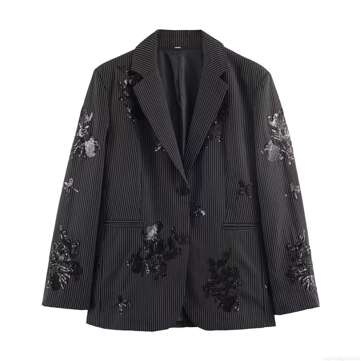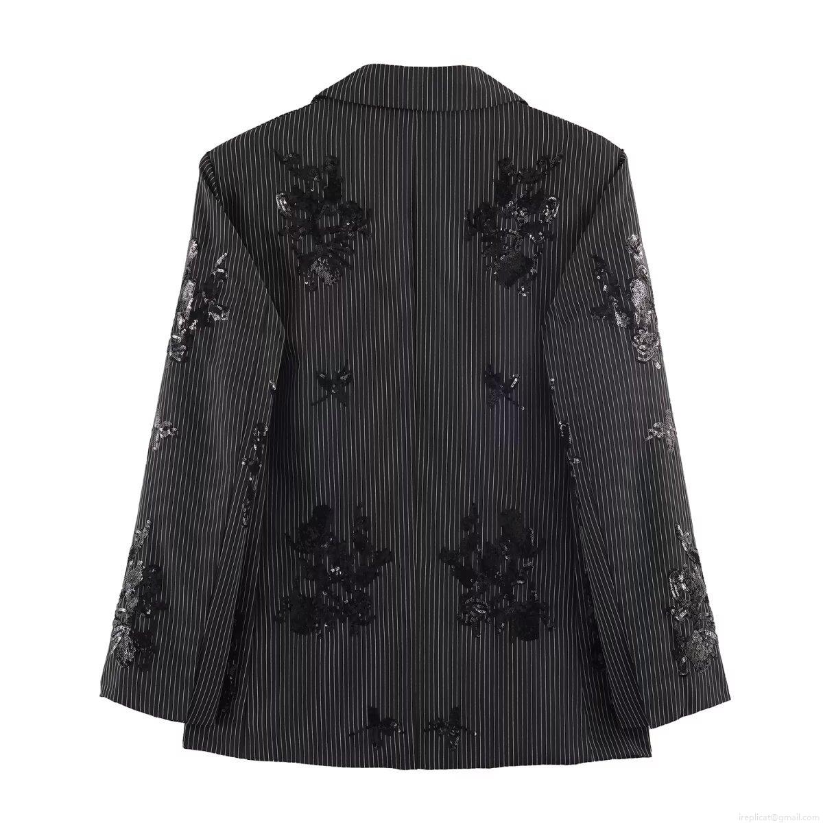 • Elegant Women Striped Sequin Blazer Pants Two Piece Set Casual Long Sleeve Suit Jacket Wide Leg Trousers Floral Embroidery Stage Party Streetwear Outfit
