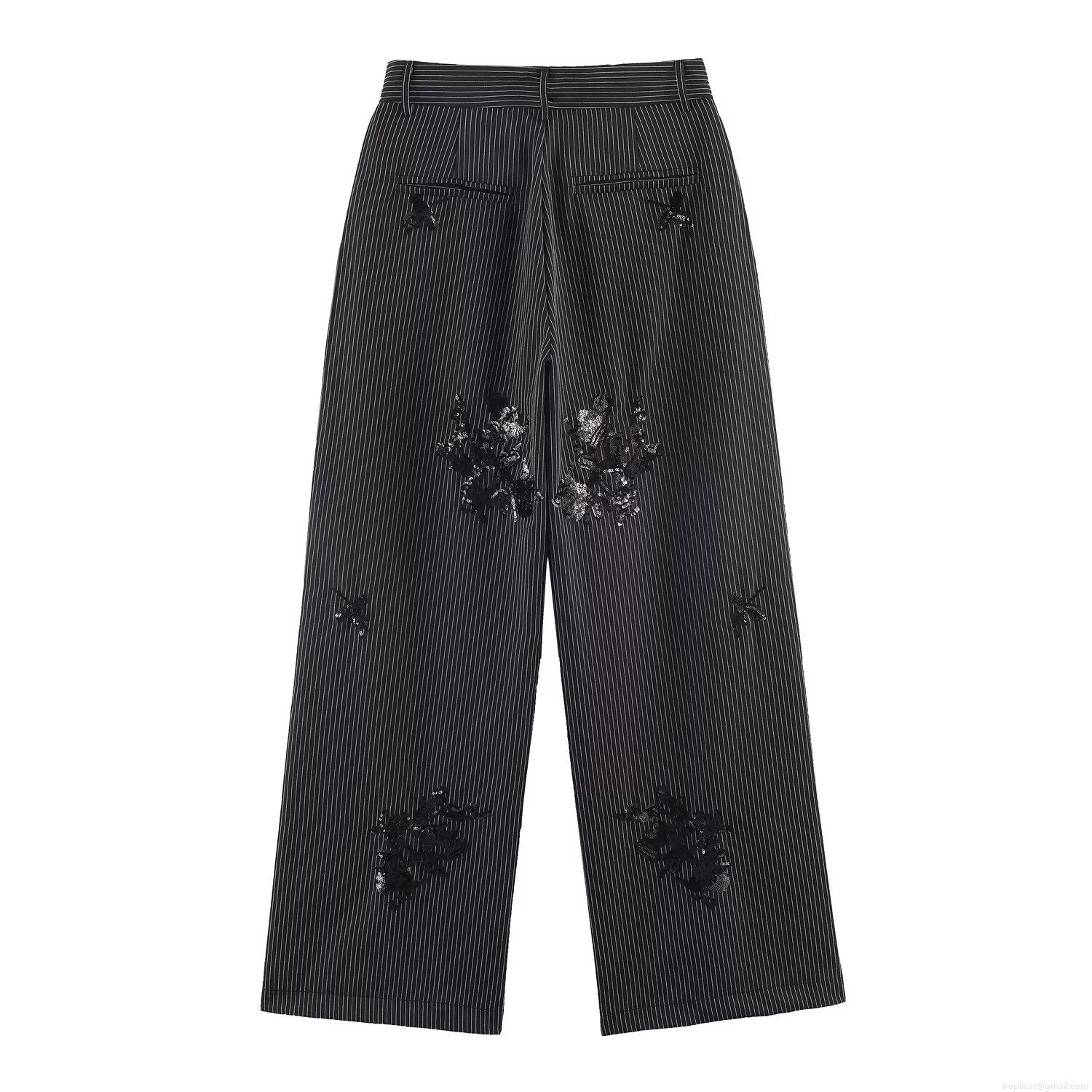 Elegant Women Striped Sequin Blazer Pants Two Piece Set Casual Long Sleeve Suit Jacket Wide Leg Trousers Floral Embroidery Stage Party Streetwear Outfit