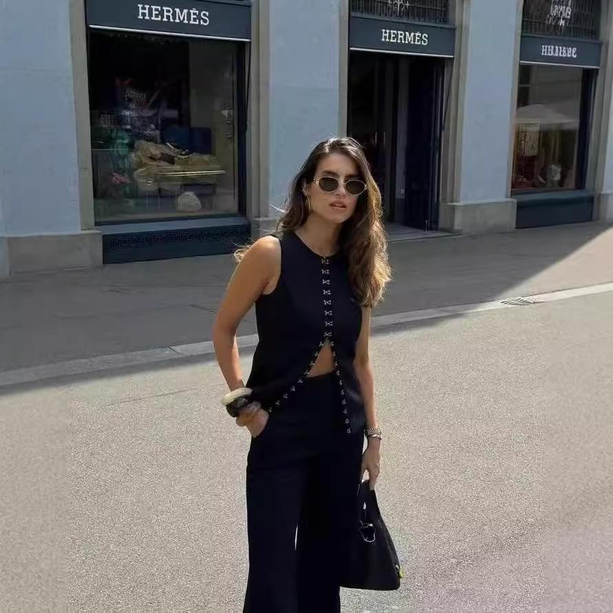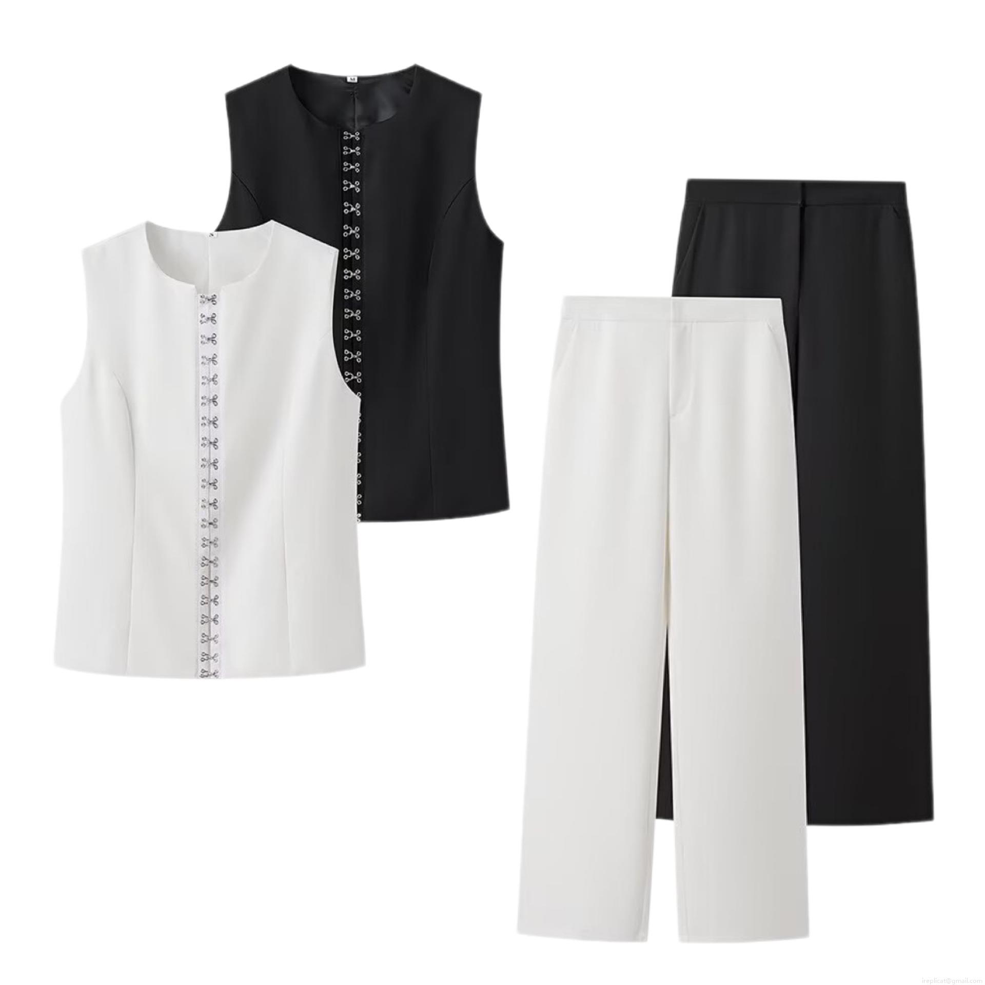 French Style Women's Two Piece Set Sleeveless Hook-and-Eye Vest Top And Straight Leg Long Pants Elegant Commute Office Lady Outfit