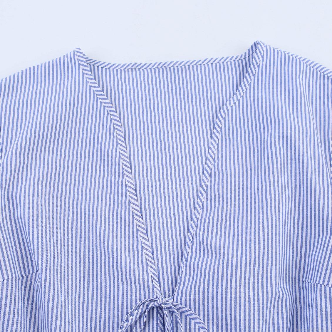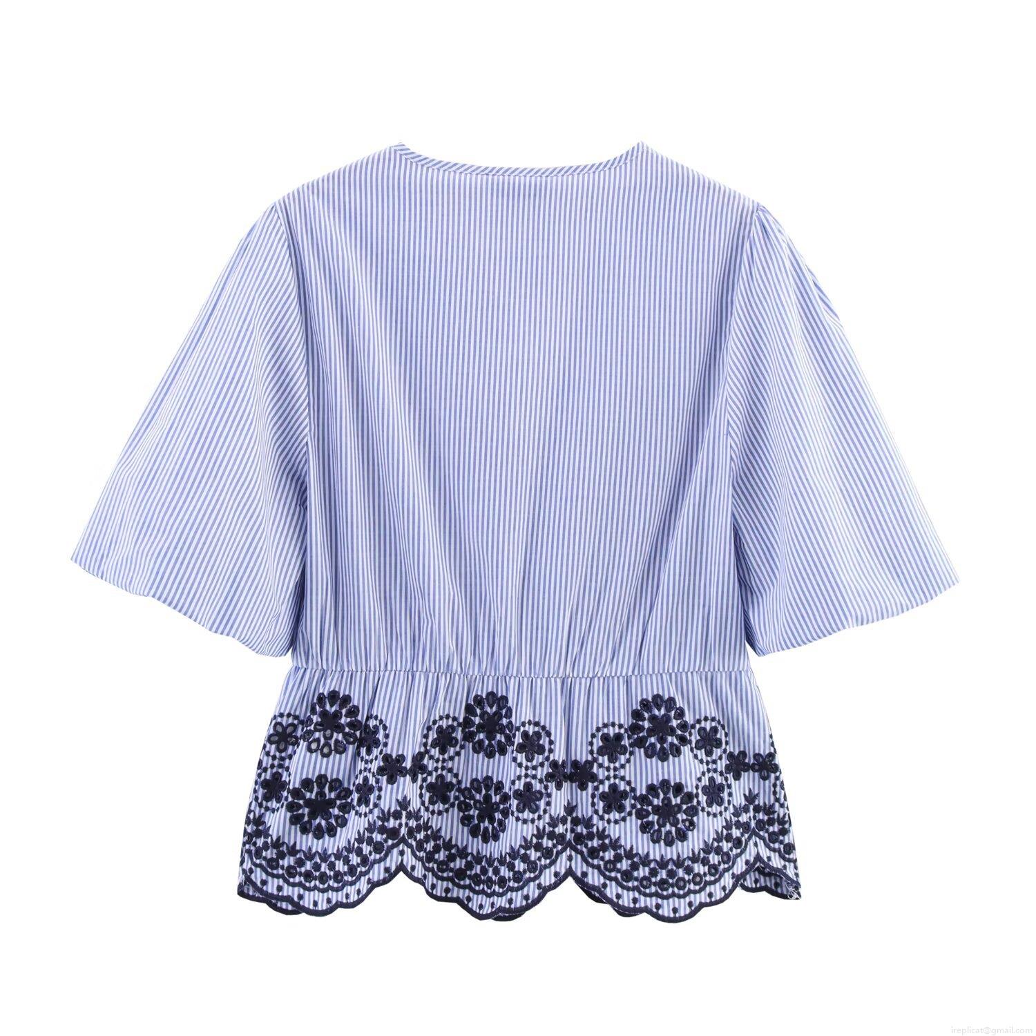 • Summer Women Blue White Striped Polyester Spandex Blend Floral Embroidery Set V Neck Tie Front Top Strapless Smocked Midi Dress Wide Leg Pants Holiday Beach Casual Clothing