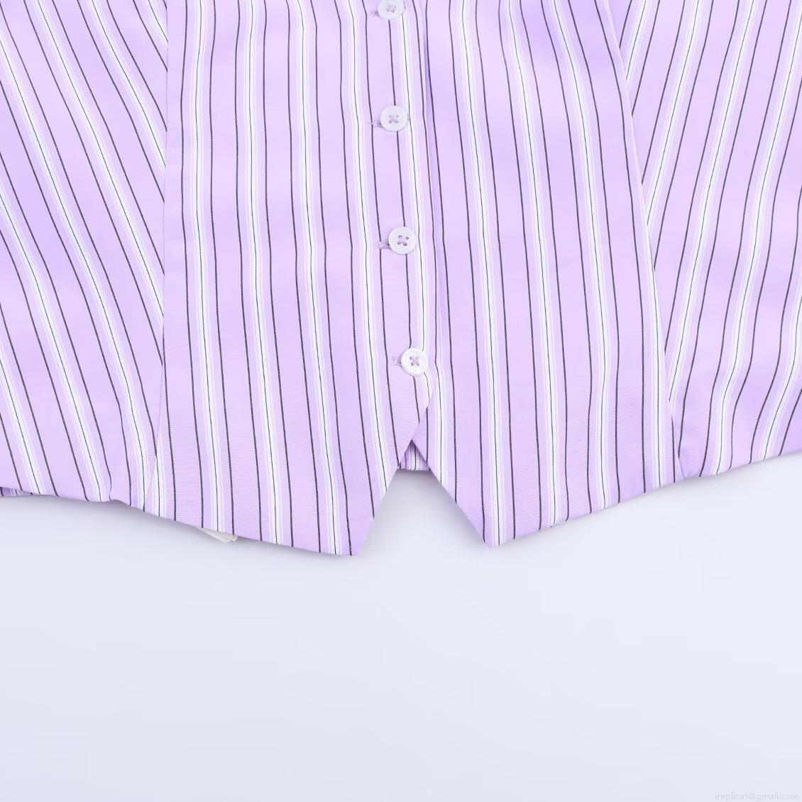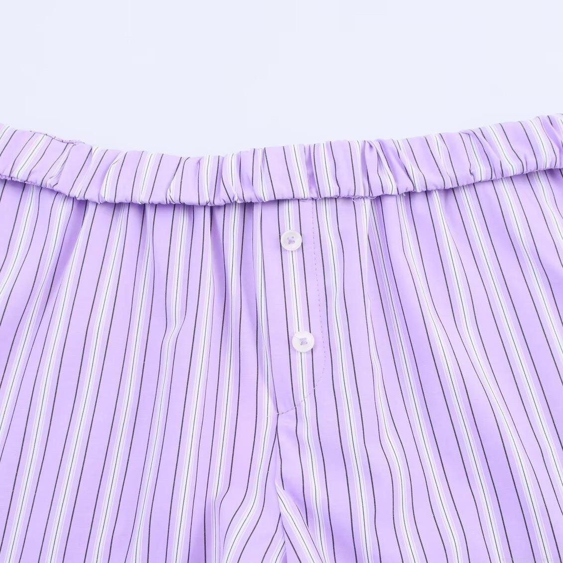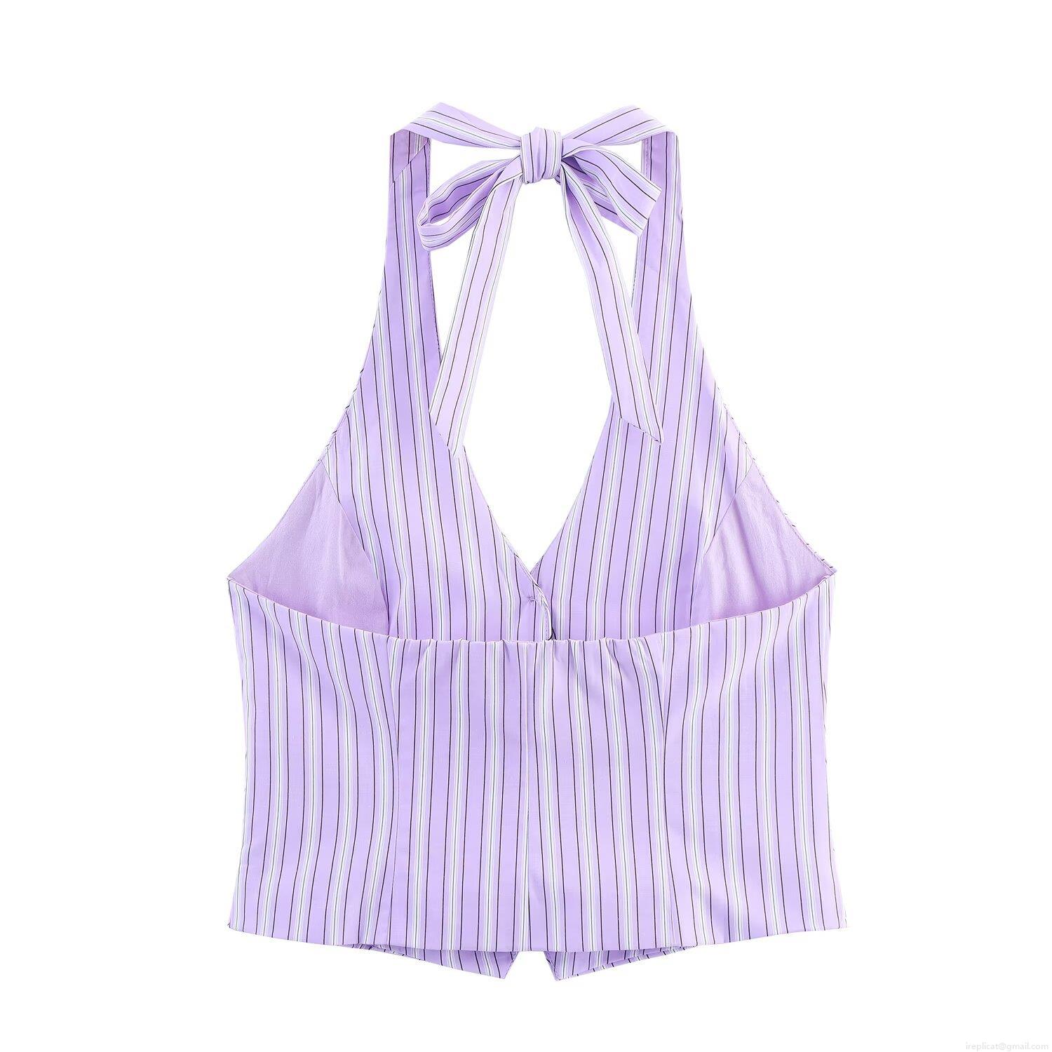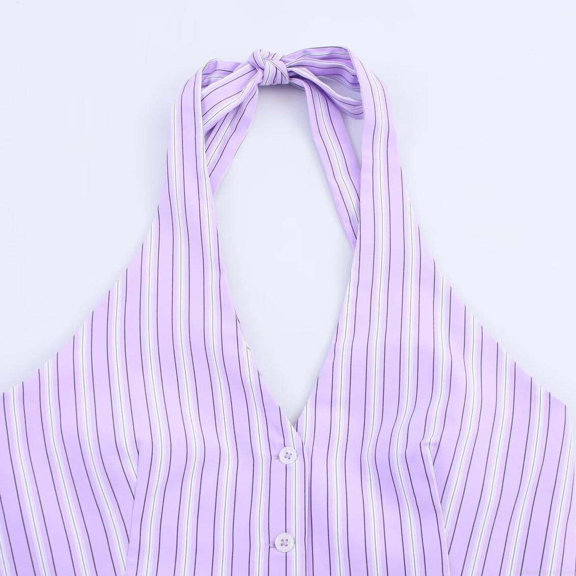 Summer Women Purple White Vertical Striped Halter Neck Sleeveless Top Or Elastic Waist Shorts Polyester Spandex Two Piece Outfit For Vacation Beach Sweet Casual Set