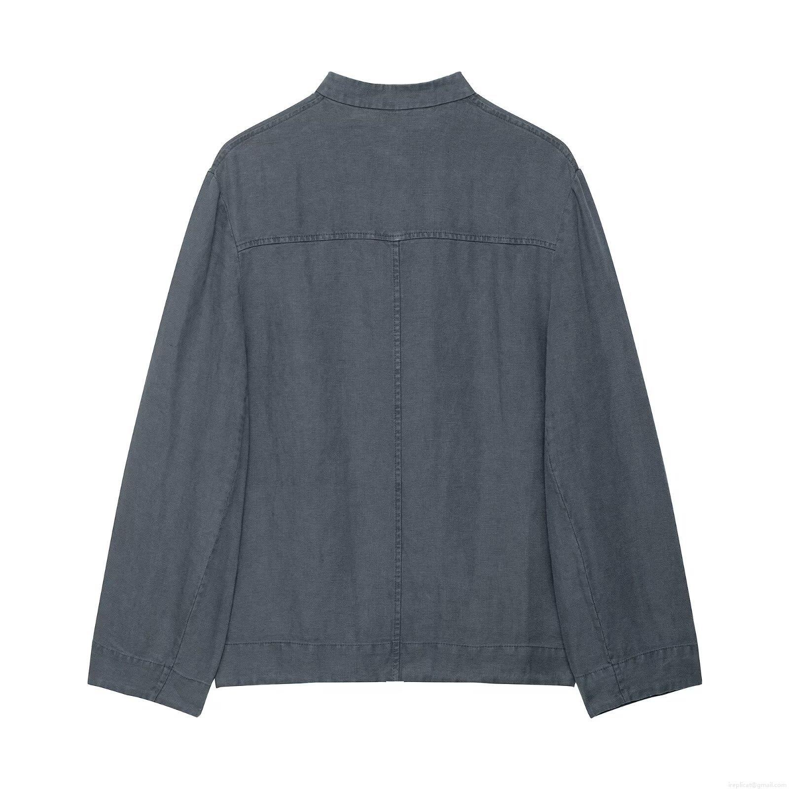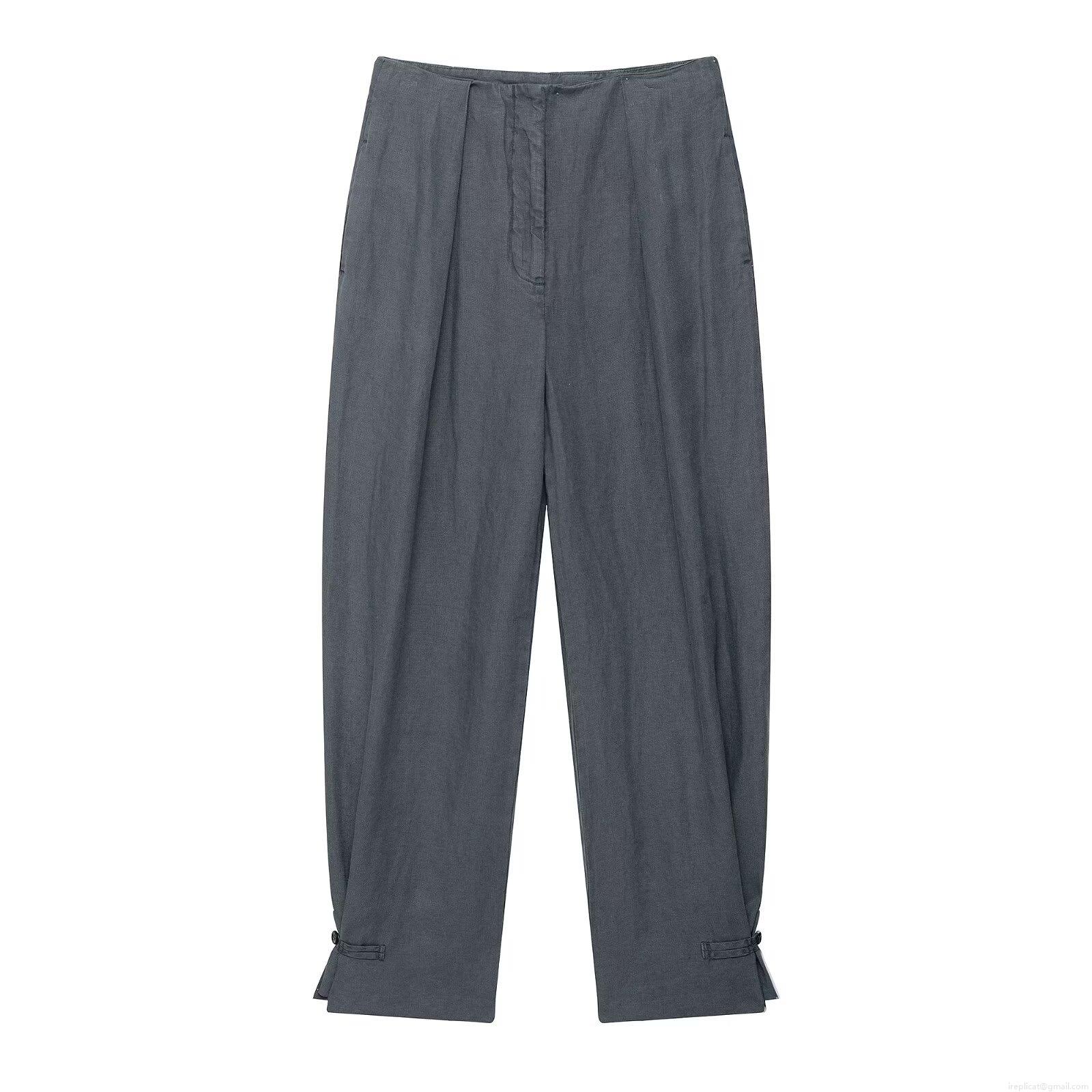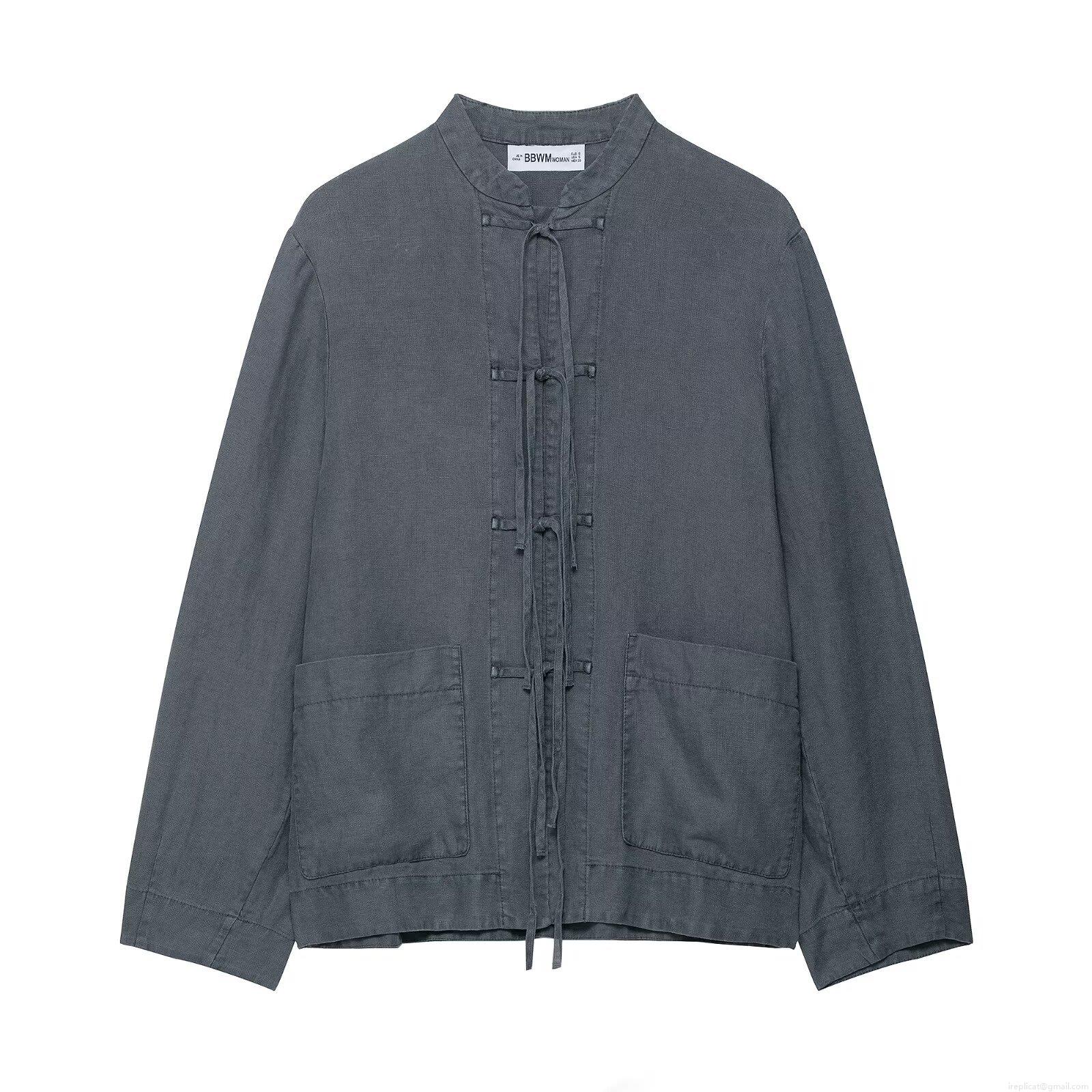 • Women 2 Piece Set Linen Look 100% Polyester Deep Gray Standing Collar Tie-Up Long Sleeve Jacket and High Waist Wide Leg Pants Casual Suit Streetwear