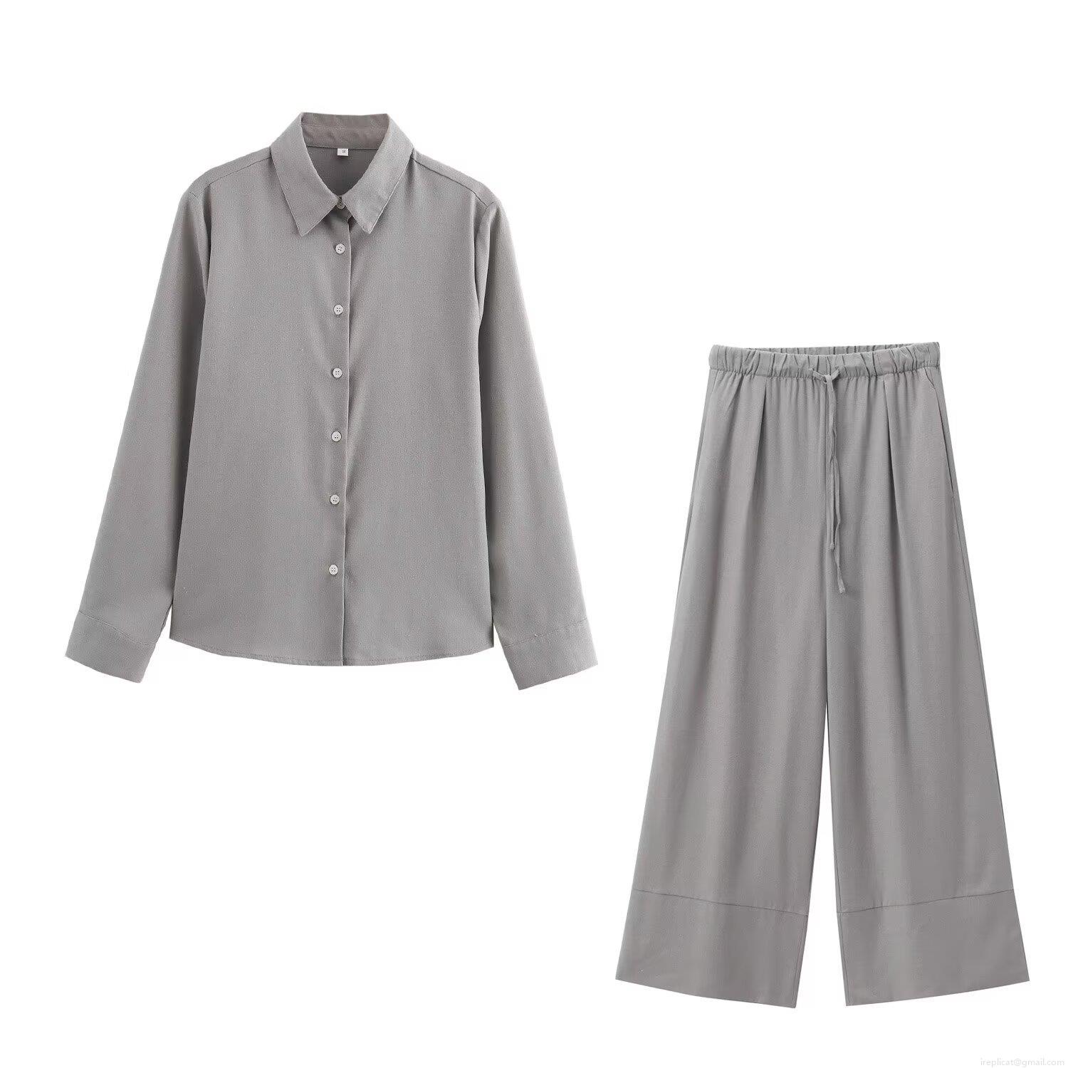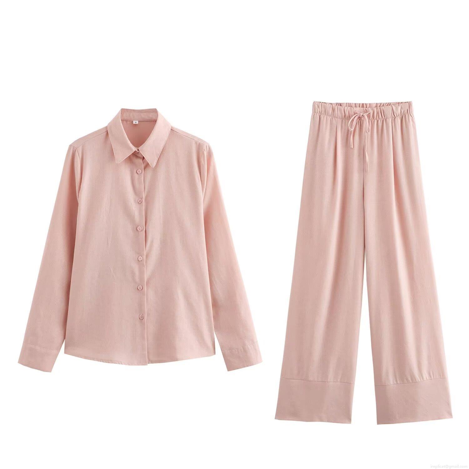 • Women Casual 2 Piece Set Button Down Long Sleeve Lapel Shirt And High Waist Drawstring Wide Leg Pants Solid Color Loungewear Tracksuit Outfits