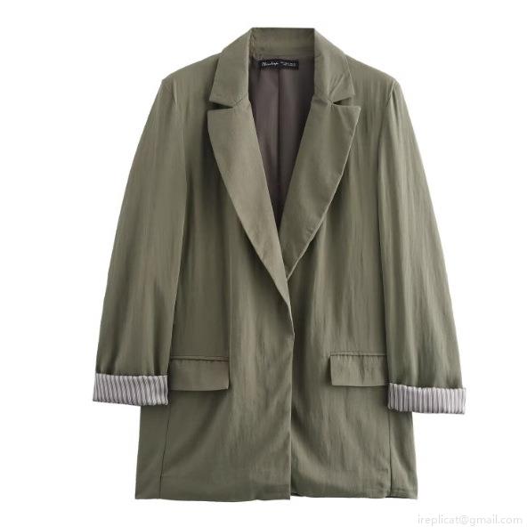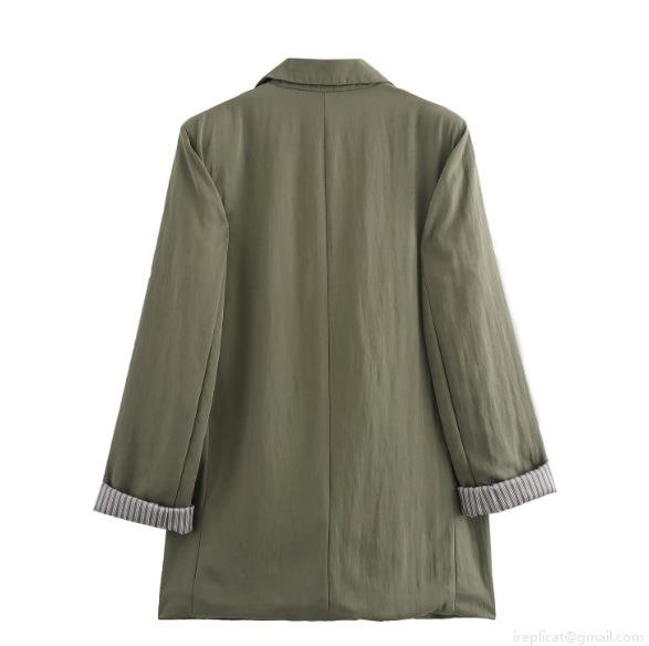 • Women Casual Blazer Suit Two Piece Set Long Sleeve Roll-up Stripe Cuffs Jacket and High Waist Straight Leg Pants Olive Green Streetwear Outfit