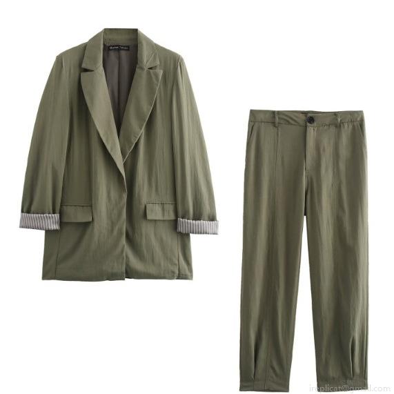 Women Casual Blazer Suit Two Piece Set Long Sleeve Roll-up Stripe Cuffs Jacket and High Waist Straight Leg Pants Olive Green Streetwear Outfit