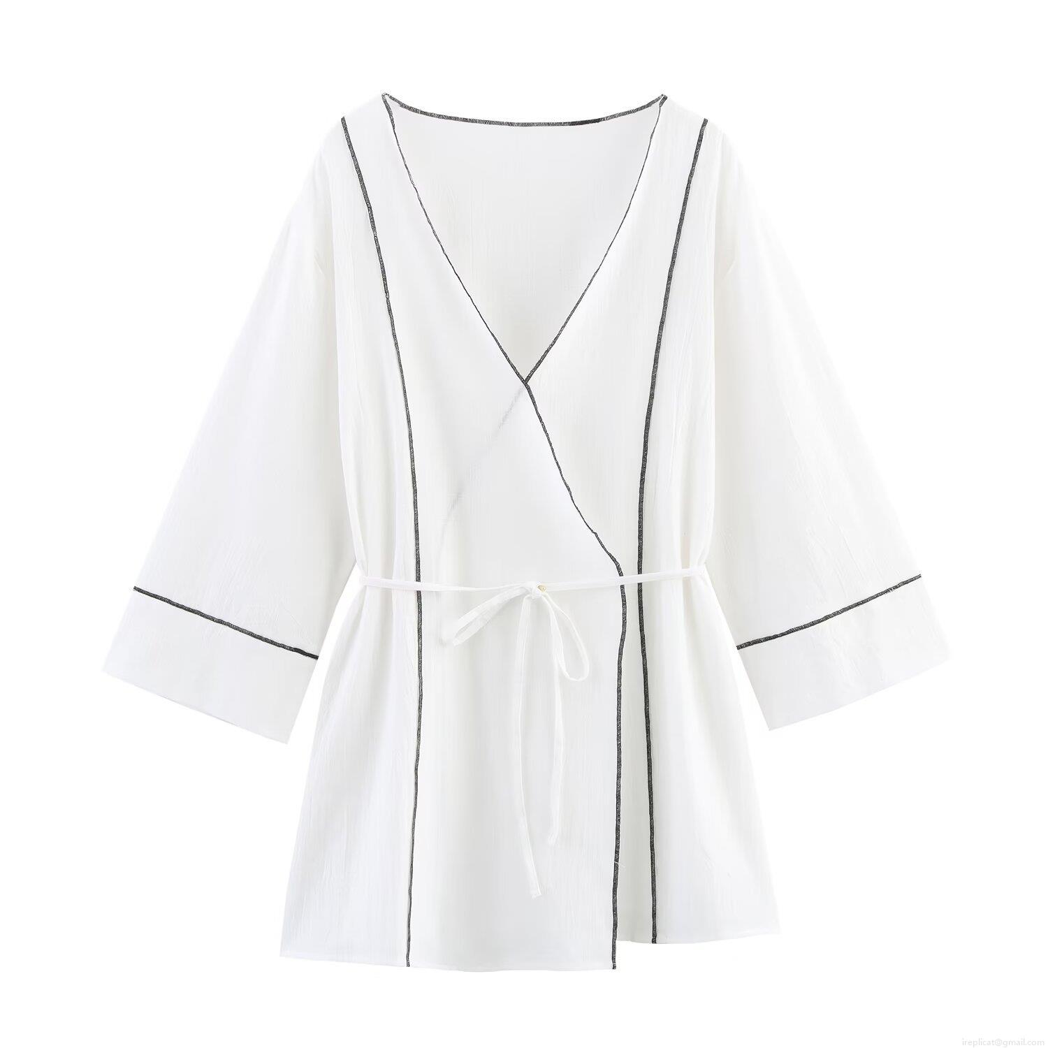 Women Casual Contrast Trim Two Piece Set Loose Kimono Tie Front Top And Wide Leg Pants Polyester Crepe Texture Spring Outfit For Streetwear