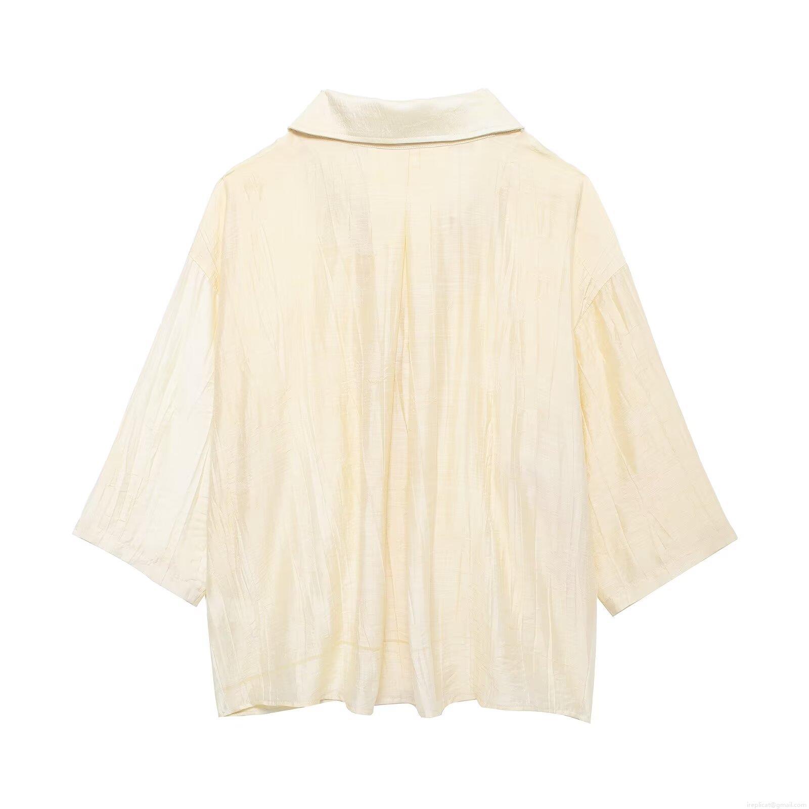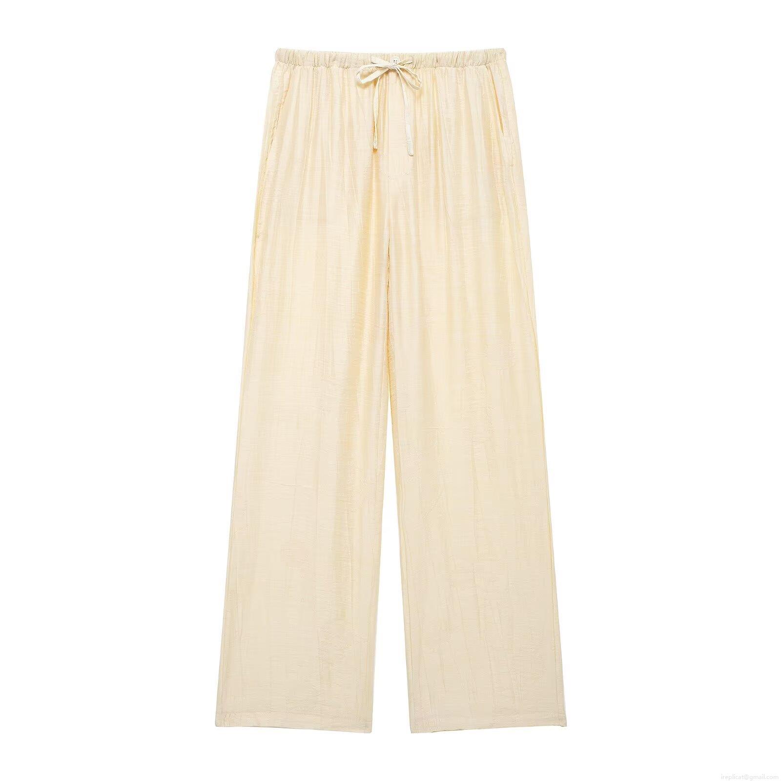• Women Casual Crinkle Jacquard Two Piece Set 100% Polyester Loose Long Sleeve Shirt And Wide Leg Pants Lounge Wear Street Style Solid Color Outfits