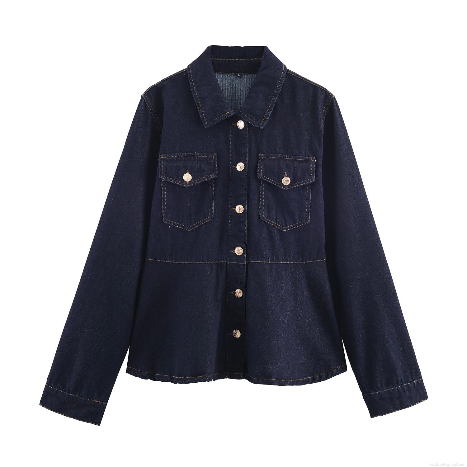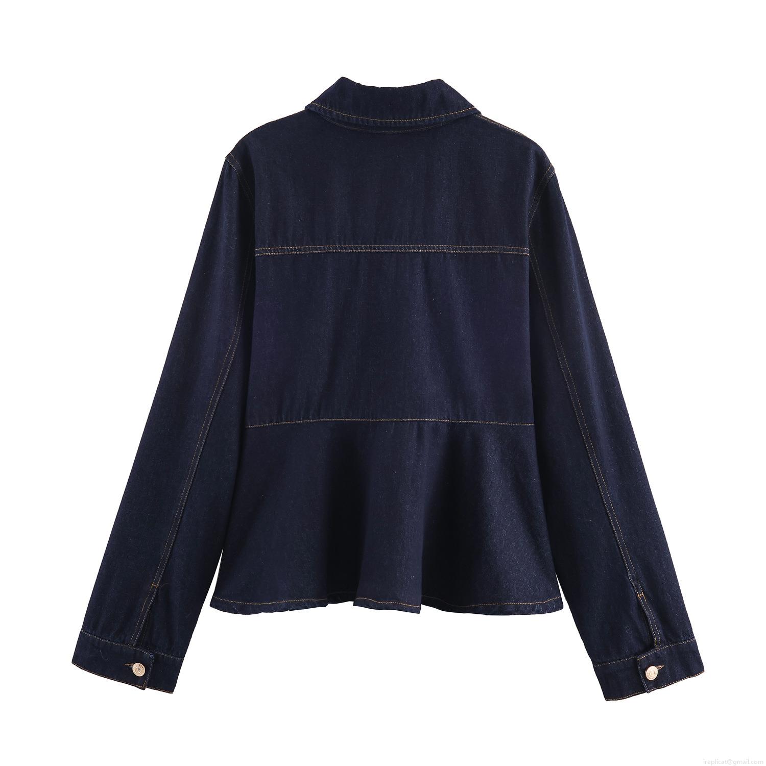 Women Casual Deep Blue Denim Jacket Pants Set Puff Sleeve Ruffle Hem Contrast Stitching Cotton Blend Two Piece Jeans Outfit Streetwear
