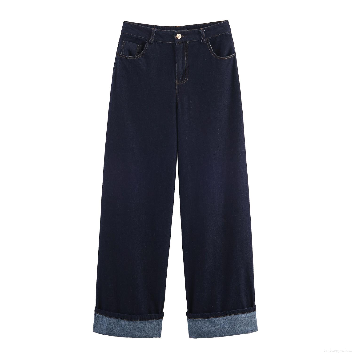 • Women Casual Deep Blue Denim Jacket Pants Set Puff Sleeve Ruffle Hem Contrast Stitching Cotton Blend Two Piece Jeans Outfit Streetwear
