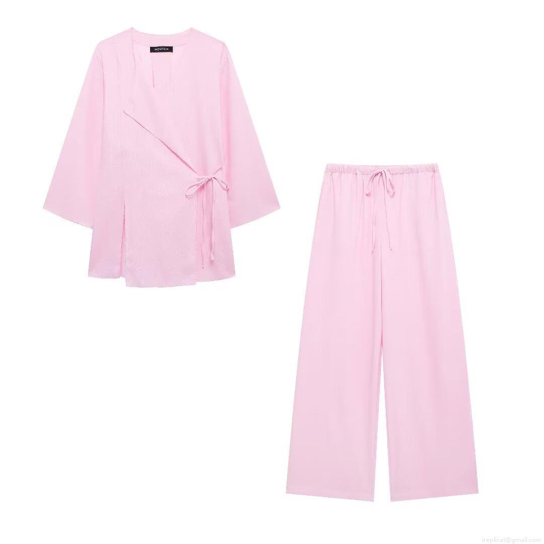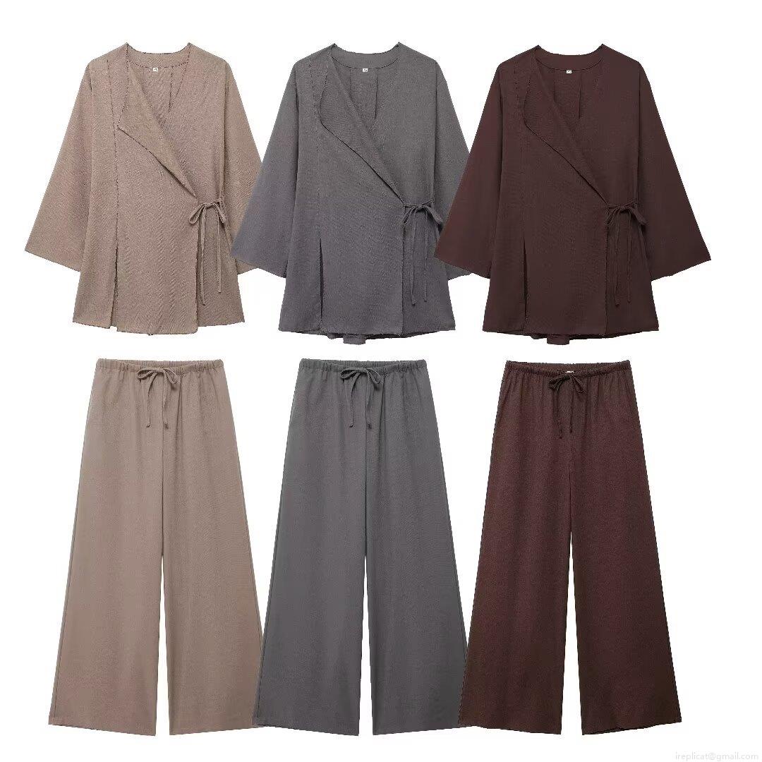 • Women Casual Pants Set Two Piece Outfits Cotton Linen Blend V Neck Kimono Wrap Tie Up Long Sleeve Top Wide Leg Drawstring Pants Lounge Wear Streetwear Solid Color Set