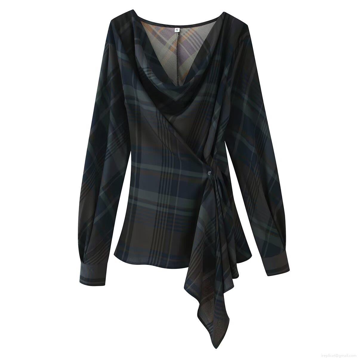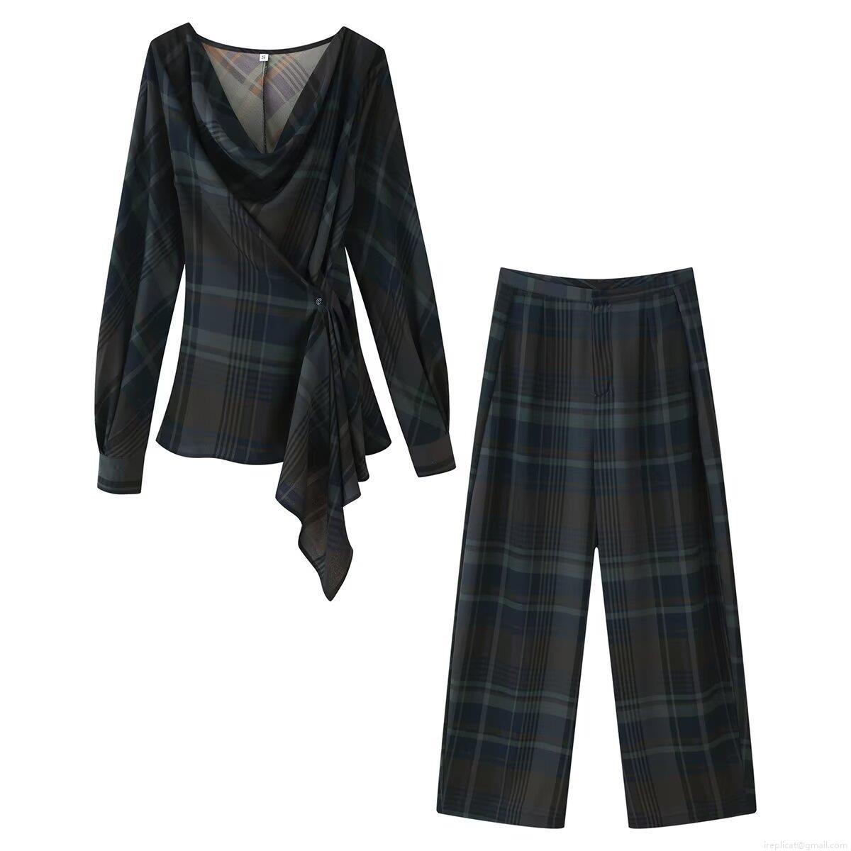 • Women Casual Plaid Two Piece Set Cowl Neck Asymmetrical Draped Long Sleeve Top And Wide Leg Balloon Pants Streetwear Outfits