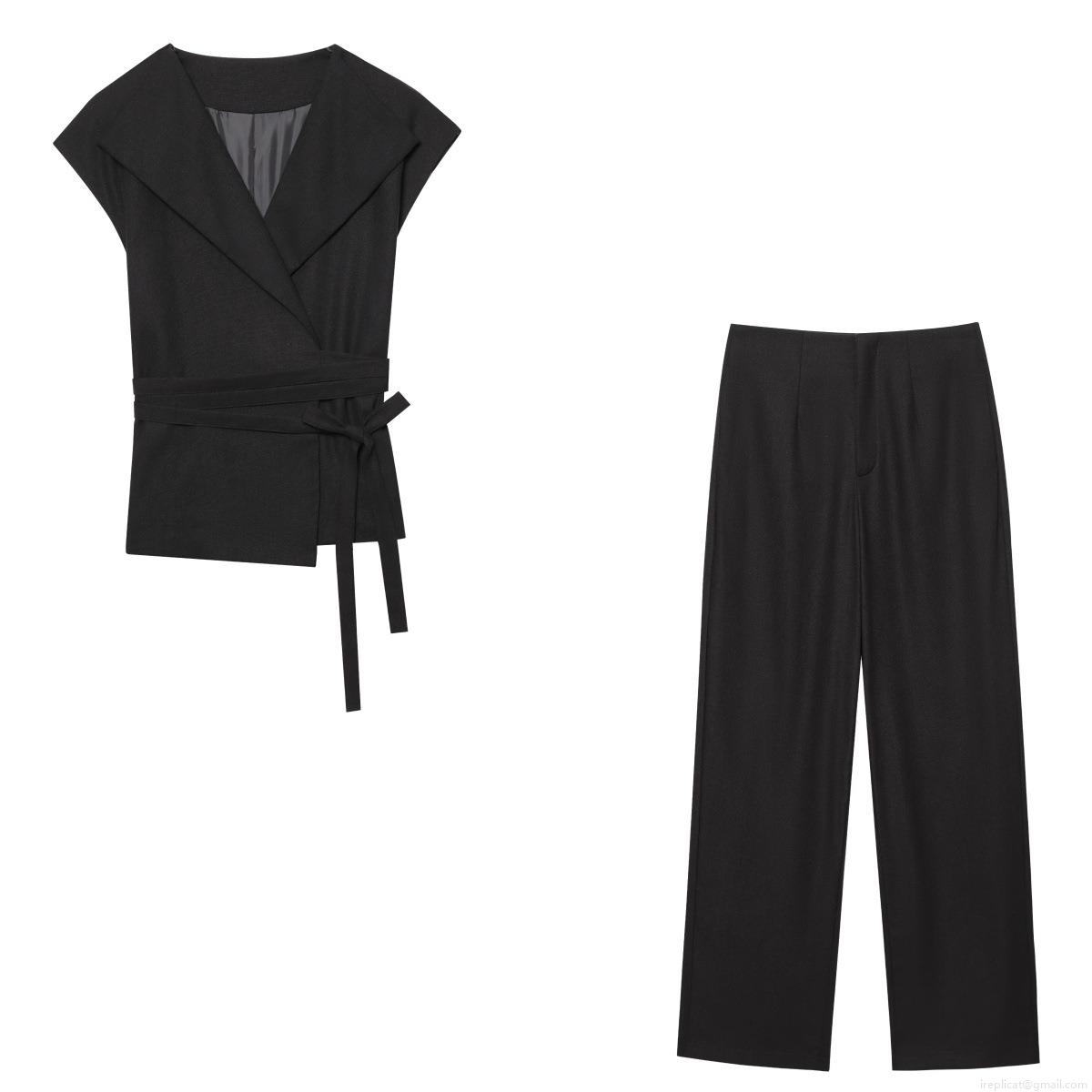 • Women Casual Sleeveless Lapel Vest Top And Wide Leg Pants Two Piece Set Polyester Linen Blend Tie Waist Streetwear Summer Suit For Ladies Summer Vacation Outfit Elegant Solid Color High Waist Trouser Set